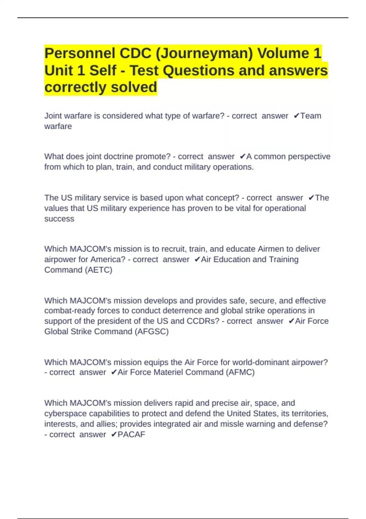 Personnel CDC (Journeyman) Volume 1 Unit 1 Self - Test Questions and answers correctly solved Joint warfare is considered what type of warfare? - correct answer Team warfare What does joint doctrine promote? - correct answer A common perspective from which to pl