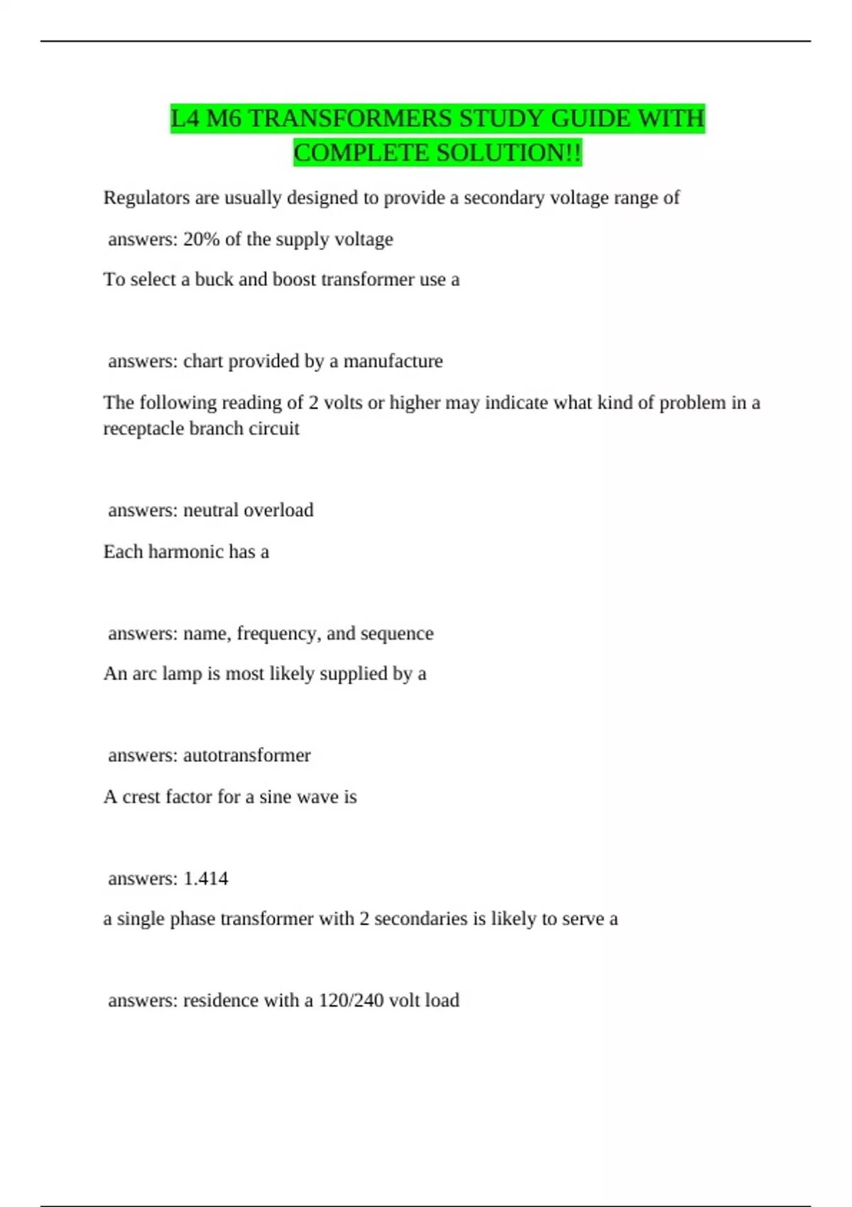 L4 M6 TRANSFORMERS STUDY GUIDE WITH COMPLETE SOLUTION!!