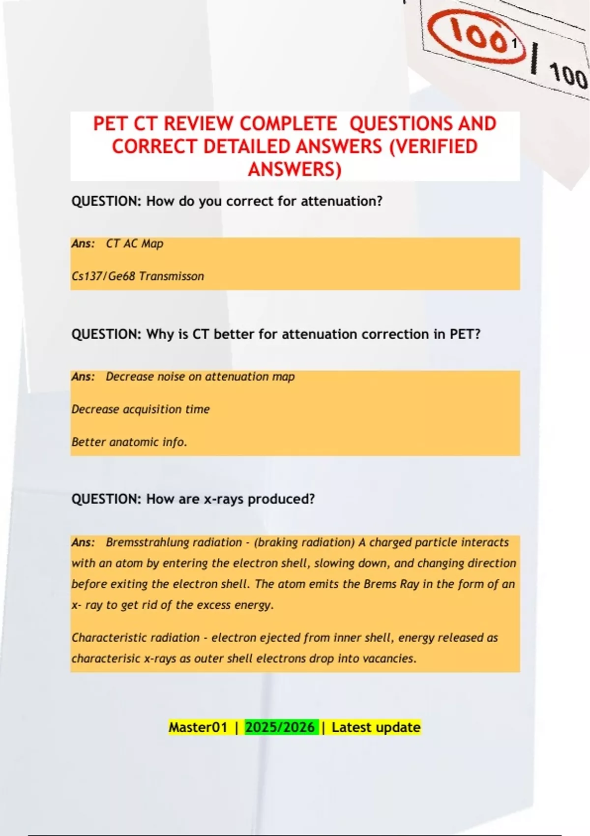 QUESTION: How do you correct for attenuation? Ans: CT AC Map Cs137/Ge68 Transmisson QUESTION: Why is CT better for attenuation correction in PET? Ans: Decrease noise on attenuation map Decrease acquisition time Better anatomic info. QUESTION: How are x-rays produced? Ans: Bremsstrahlung radiation - (braking radiation) A charged particle interacts with an atom by entering the electron shell, slowing down, and changing direction before exiting the electron shell. The atom emits the Brems Ray in the form of an x- ray to get rid of the excess energy. Characteristic radiation - electron ejected from inner shell, energy released as characterisic x-rays as outer shell electrons drop into vacancies. 2 Master01 | 2025/2026 | Latest update QUESTION: How are x-rays produced in an x-ray tube Ans: Current is applied to the filament of the cathode (-), this produces an electron cloud (and increases mAs). The electron cloud is accelerated towards anode (+) when voltage is applied to the anode (increasing kVp). The electrons strike the anode on the target producing x-rays. QUESTION: When you increase kVp = Ans: Increase x-ray energy Increase penetration of object Decrease noise Decrease beam hardening Increase pt. dose Decrease contrast QUESTION: When you increase mA