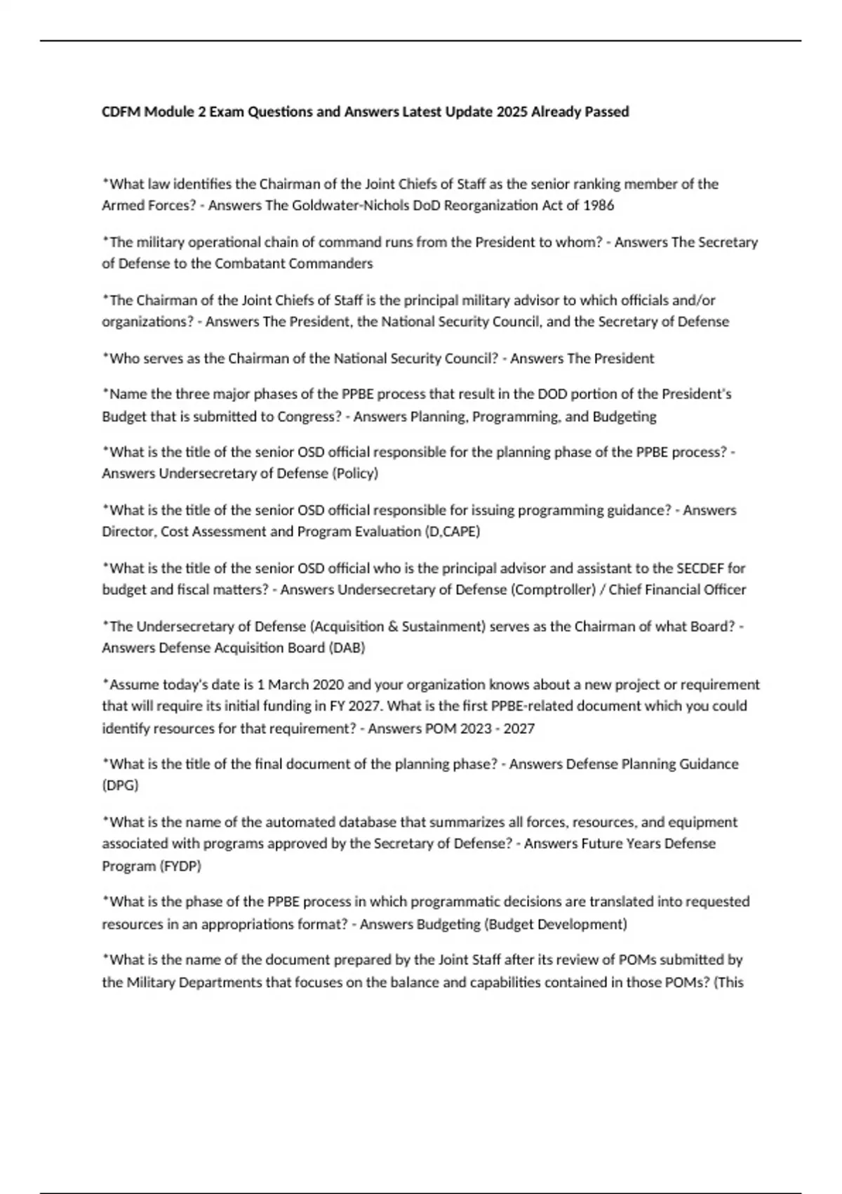 CDFM Module 2 Exam Questions and Answers Latest Update 2025 Already Passed *What law identifies the Chairman of the Joint Chiefs of Staff as the senior ranking member of the Armed Forces? - Answers The Goldwater-Nichols DoD Reorganization Act of 1986 *The military operational chain of command runs from the President to whom? - Answers The Secretary of Defense to the Combatant Commanders *The Chairman of the Joint Chiefs of Staff is the principal military advisor to which officials and/or organizations? - Answers The President, the National Security Council, and the Secretary of Defense *Who serves as the Chairman of the National Security Council? - Answers The President *Name the three major phases of the PPBE process that result in the DOD portion of the President's Budget that is submitted to Congress? - Answers Planning, Programming, and Budgeting *What is the title of the senior OSD official responsible for the planning phase of the PPBE process? - Answers Undersecretary of Defense (Policy) *What is the title of the senior OSD official responsible for issuing programming guidance? - Answers Director, Cost Assessment and Program Evaluation (D,CAPE) *What is the title of the senior OSD official who is the principal advisor and assistant to the SECDEF for budget and fiscal matters? - Answers Undersecretary of Defense (Comptroller) / Chief Financial Officer *The Undersecretary of Defense (Acquisition & Sustainment) serves as the Chairman of what Board? - Answers Defense Acquisition Board (DAB) *Assume today's date is 1 March 2020 and your organization knows about a new project or requirement that will require its initial funding in FY 2027. What is the first PPBE-related document which you could identify resources for that requirement? - Answers POM *What is the title of the final document of the planning phase? - Answers Defense Planning Guidance (DPG) *What is the name of the automated database that summarizes all forces, resources, and equipment associated with programs approved by the Secretary of Defense? - Answers Future Years Defense Program (FYDP) *What is the phase of the PPBE process in which programmatic decisions are translated into requested resources in an appropriations format? - Answers Budgeting (Budget Development) *What is the name of the document prepared by the Joint Staff after its review of POMs submitted by the Military Departments that focuses on the balance and capabilities contained in those POMs? (This document provides the SECDEF with the JCS evaluation of the Military Departments' POM submissions) - Answers Chairman's Program Assessment (CPA) [Chairman, JCS] *Following a review of a Component's budget submission and a potential budget hearing in the fall timeframe, the reviewing USD(C) budget analyst prepares a draft document that is submitted to DEPSECDEF or SECDEF for a decision. Once signed by one of those senior officials, what is that document called? - Answers Program Budget Decision *Advance Procurement is an exception to what funding policy? - Answers Full Funding Within what type document does Congress specify the number of fiscal years that an appropriation account remains current and available for new obligations? - Answers An appropriation bill (becomes a law when signed by the President) *Assume an agency has issued an Economy Act order to another Federal agency for specific services, the cited appropriation has gone into an expired status, and the servicing agency has neither provided the ordered services nor has entered into an authorized contract with another entity to provide the ordered services. What must now be done with those obligated funds? - Answers De-obligate *What is the term used for shifting funds between appropriations? - Answers Transfer action *What is the long-term financial goal of a working capital fund? - Answers To break even *A working capital fund has an officer (O-4) properly assigned to the organization and that officer is doing the work that would normally be performed by a GS-13. For managerial cost accounting purposes, is the "cost" of that officer's pay and benefits "charged" at the military O-4 rate or the civilian GS-13 rate? - Answers Civilian GS-13 rate (and the proper MILPER account is reimbursed for that amount) *Assume your organization overpaid a contractor on a contract awarded with an appropriation that is now in the cancelled status, and the contractor has sent in a check for that overpayment. What can your organization legally do with that refund from the contractor? - Answers Credit the refund to miscellaneous receipts of the U.S. Treasury *Monies not appropriated by Congress that are generated primarily from the sale of goods and services are known as what? - Answers Non-appropriated Funds (NAF) *The Defense Acquisition System is the management process that guides DoD acquisition programs and is basically the process by which programmatic risk is managed. What are the three programmatic risks that must be successfully managed? - Answers Cost, Schedule, and Performance Risks *What are the appropriations that may be used to fund an acquisition program? - Answers RDT&E, Procurement, O$M, MILCON, and MILPERS *What is the term used to describe dollars shown in the life cycle cost estimate wherin the effects of inflation are not considered? - Answers Base year dollars or Constant year dollars *What is the term used to describe dollars used for programming and budgeting purposes wherin the effects of inflation are considered? - Answers Then-year dollars or Current year dollars *What cost structure does MIL-STD-881C represent? - Answers Work Breakdown Structure (WBS) *Which cost estimating method is based on direct comparison with historical information of one similar system? - Answers Analogy Method *Which cost estimating method requires extensive knowledge of the product or process? - Answers Engineering Approach *What are the methods/steps in conducting the Delphi Technique? - Answers Query expert opinion