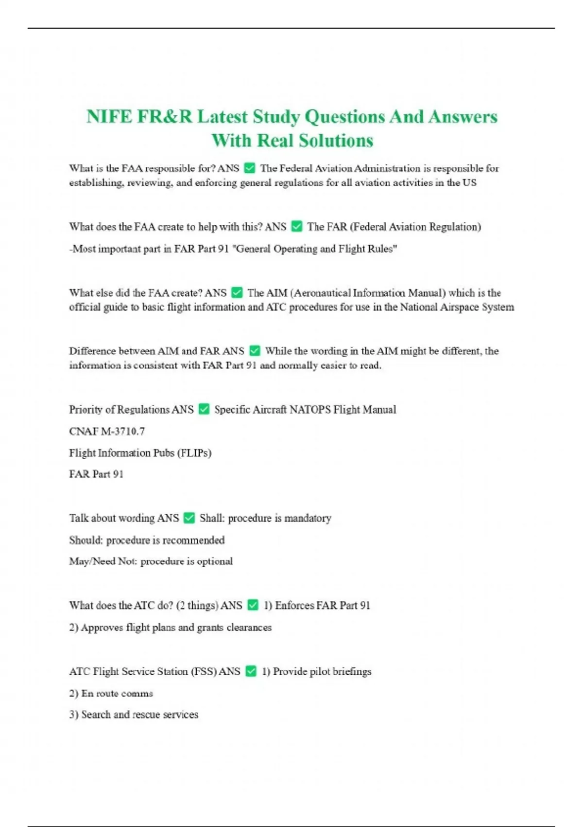 NIFE FR&R Latest Study Questions And Answers With Real Solutions What is the FAA responsible for? ANS The Federal Aviation Administration is responsible for establishing, reviewing, and enforcing general regulations for all aviation activities in the US What does the FAA create to help with this? ANS The FAR (Federal Aviation Regulation) -Most important part in FAR Part 91 "General Operating and Flight Rules" What else did the FAA create? ANS The AIM (Aeronautical Information Manual) which is the official guide to basic flight information and ATC procedures for use in the National Airspace System Difference between AIM and FAR ANS While the wording in the AIM might be different, the information is consistent with FAR Part 91 and normally easier to read.