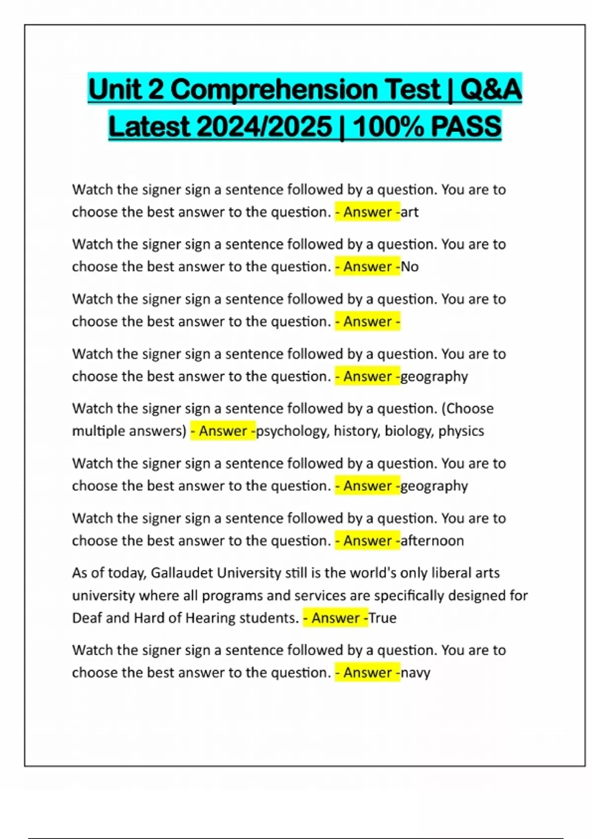 Unit 2 Comprehension Test | Q&A Latest 2024/2025 | 100% PASS Watch the signer sign a sentence followed by a question. You are to choose the best answer to the question. - Answer -art Watch the signer sign a sentence followed by a question. You are to choose the best answer to the question. - Answer -No Watch the signer sign a sentence followed by a question. You are to choose the best answer to the question. - Answer - Watch the signer sign a sentence followed by a question. You are to choose the best answer to the question. - Answer -geography Watch the signer sign a sentence followed by a question.
