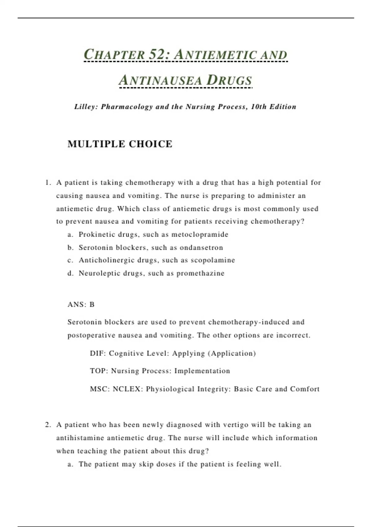 Lilley: Pharmacology and the Nursing Process, 10th Edition MULTIPLE CHOICE 1. A patient is taking chemotherapy with a drug that has a high potential for causing nausea and vomiting. The nurse is preparing to administer an antiemetic drug. Which class of antiemetic drugs is most commonly used to prevent nausea and vomiting for patients receiving chemotherapy? a. Prokinetic drugs, such as metoclopramide b. Serotonin blockers, such as ondansetron c. Anticholinergic drugs, such as scopolamine d. Neuroleptic drugs, such as promethazine ANS: B Serotonin blockers are used to prevent chemotherapy-induced and postoperative nausea and vomiting. The other options are incorrect. DIF: Cognitive Level: Applying (Application) TOP: Nursing Process: Implementation MSC: NCLEX: Physiological Integrity: Basic Care and Comfort 2. A patient who has been newly diagnosed with vertigo will be taking an antihistamine antiemetic drug. The nurse will include which information when teaching the patient about this drug? a. The patient may skip doses if the patient is feeling well. b. The patient will need to avoid driving because of possible drowsiness. c. The patient may experience occasional problems with taste. d. It is safe to take the medication with a glass of wine in the evening to help settle the stomach. ANS: B Drowsiness may occur because of central nervous system (CNS) depression, and patients should avoid driving or working with heavy machinery because of possible sedation. These drugs must not be taken with alcohol or other CNS depressants because of possible additive depressant effects. The medication should be taken as instructed and not skipped unless instructed to do so. DIF: Cognitive Level: Applying (Application) TOP: Nursing Process: Implementation MSC: NCLEX: Physiological Integrity: Pharmacological and Parenteral Therapies 3. A patient with motion sickness is planning a cross-country car trip and has a new prescription for a scopolamine transdermal patch. The nurse provides teaching for the use of this patch medication. The patient shows a correct understanding of the teaching with which statement? a. “I will change the patch every day.” b. “I will change the patch every other day.” c. “I will change the patch every 3 days.” d. “I will remove the patch only if it stops working.”