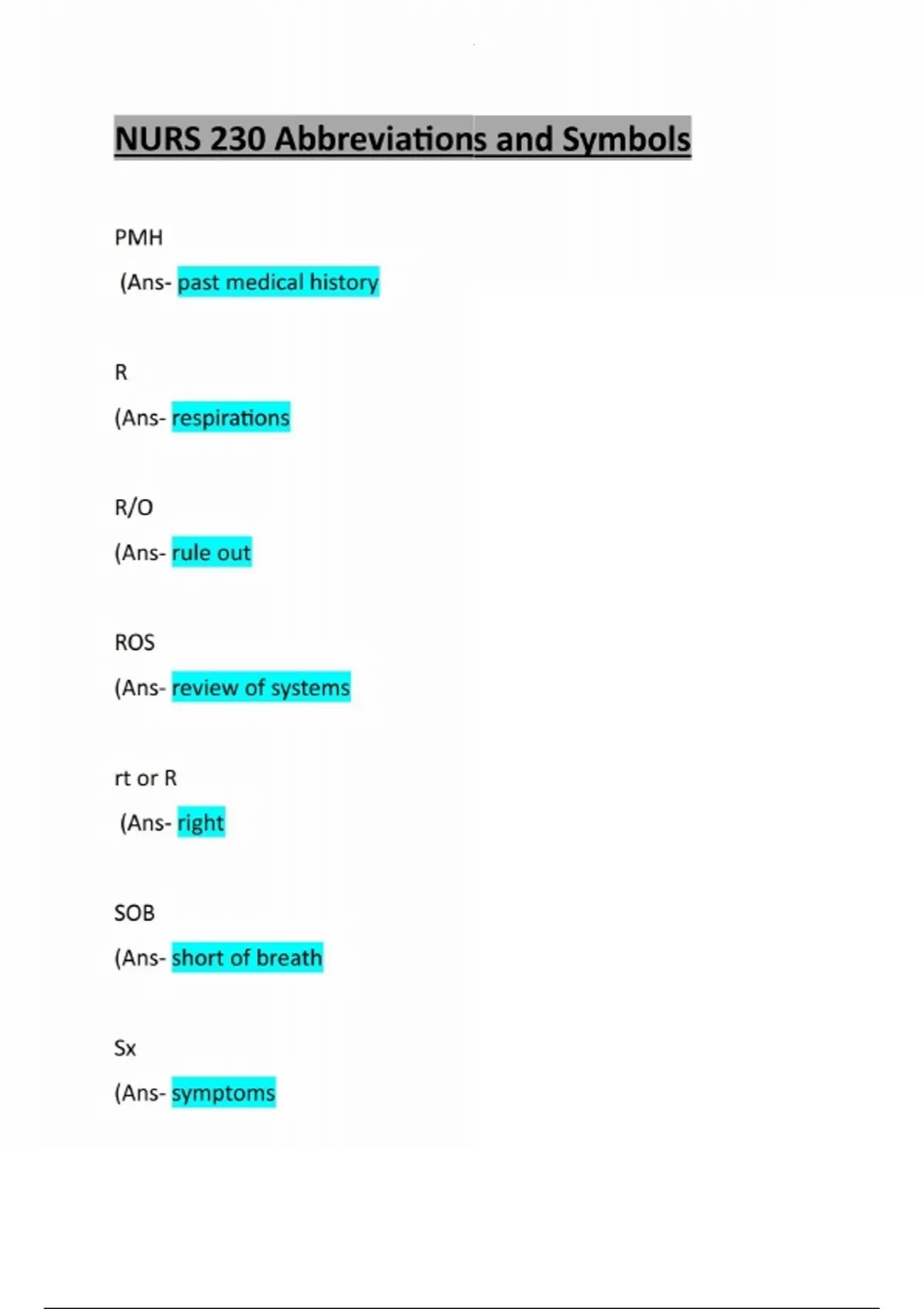 PMH (Ans- past medical history R (Ans- respirations R/O (Ans- rule out ROS (Ans- review of systems rt or R (Ans- right SOB (Ans- short of breath Sx (Ans- symptomsT (Ans- temperature ⊕ (Ans- positive ⊖ or neg (Ans- negative ABG (Ans- arterial blood gases BE (Ans- barium enema