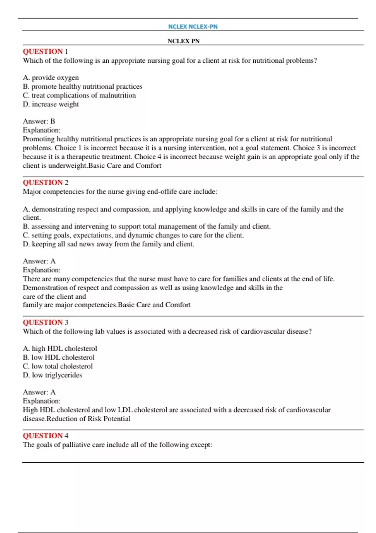 NCLEX PN Exams for 2025. All Questions with Correct Answers QUESTION 1 Which of the following is an appropriate nursing goal for a client at risk for nutritional problems? A. provide oxygen B. promote healthy nutritional practices C. treat complications of malnutrition D. increase weight Answer: B Explanation: Promoting healthy nutritional practices is an appropriate nursing goal for a client at risk for nutritional problems. Choice 1 is incorrect because it is a nursing intervention, not a goal statement. Choice 3 is incorrect because it is a therapeutic treatment. Choice 4 is incorrect because weight gain is an appropriate goal only if the client is underweight.Basic Care and Comfort QUESTION 2 Major competencies for the nurse giving end-oflife care include: A. demonstrating respect and compassion, and applying knowledge and skills in care of the family and the client. B. assessing and intervening to support total management of the family and client. C. setting goals, expectations, and dynamic changes to care for the client. D. keeping all sad news away from the family and client. Answer: A Explanation: There are many competencies that the nurse must have to care for families and clients at the end of life. Demonstration of respect and compassion as well as using knowledge and skills in the care of the client and family are major competencies.Basic Care and Comfort QUESTION 3 Which of the following lab values is associated with a decreased risk of cardiovascular disease? A. high HDL cholesterol B. low HDL cholesterol C. low total cholesterol D. low triglycerides Answer: A Explanation: High HDL cholesterol and low LDL cholesterol are associated with a decreased risk of cardiovascular disease.Reduction of Risk Potential QUESTION 4 The goals of palliative care include all of the following except: NCLEX NCLEX-PN A. giving clients with life-threatening illnesses the best quality of life possible. B. taking care of the whole person—body, mind, spirit, heart, and soul. C. no interventions are needed because the client is near death. D. support of needs of the family and client. Answer: C Explanation: The goals of palliative care include choices 1, 2, and 4. Choice 3 is not part of palliative care. All aspects of medical, emotional, social, and spiritual needs of the dying client should be focused on until the end of life.Basic Care and Comfort