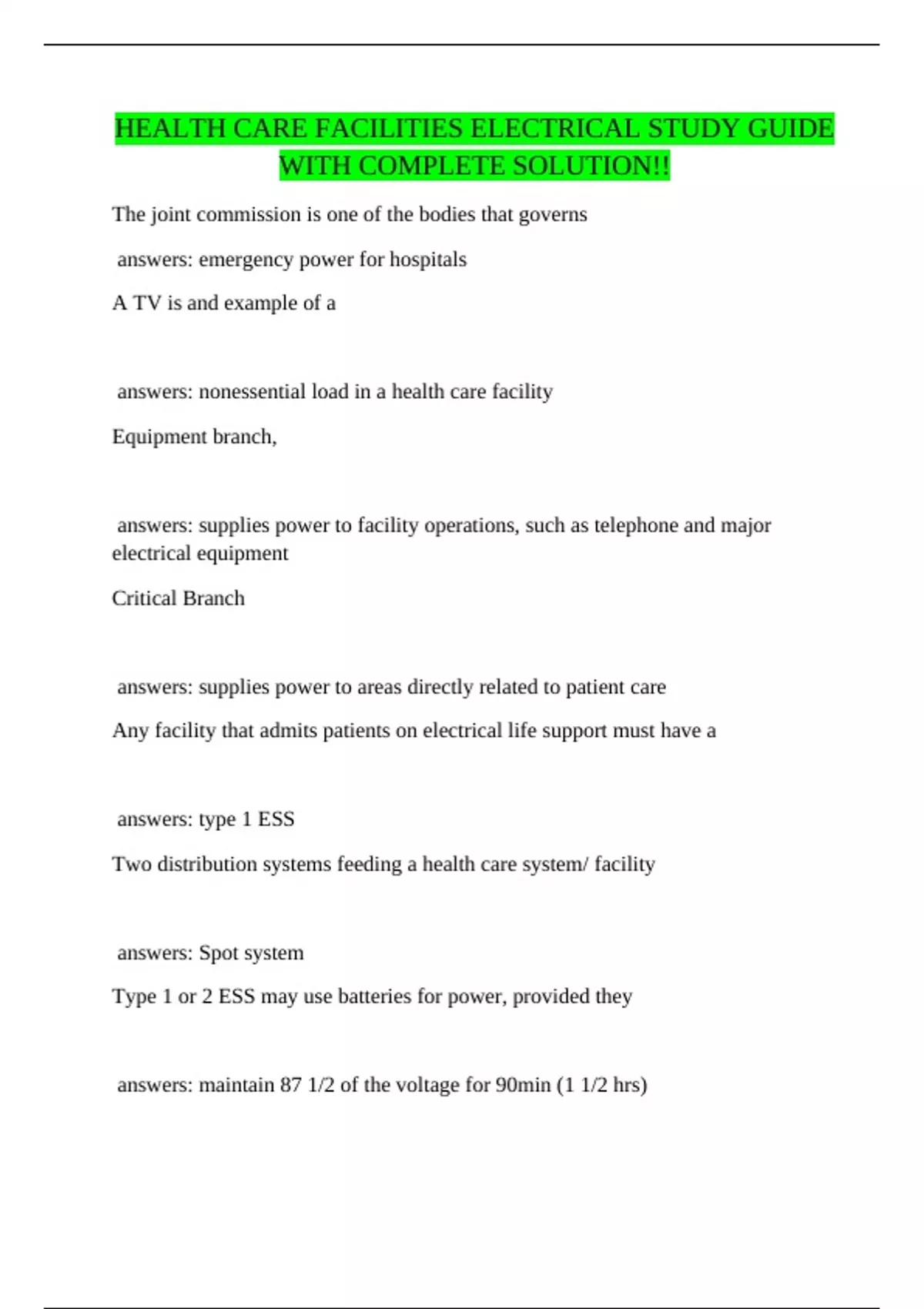 HEALTH CARE FACILITIES ELECTRICAL STUDY GUIDE WITH COMPLETE SOLUTION!!
