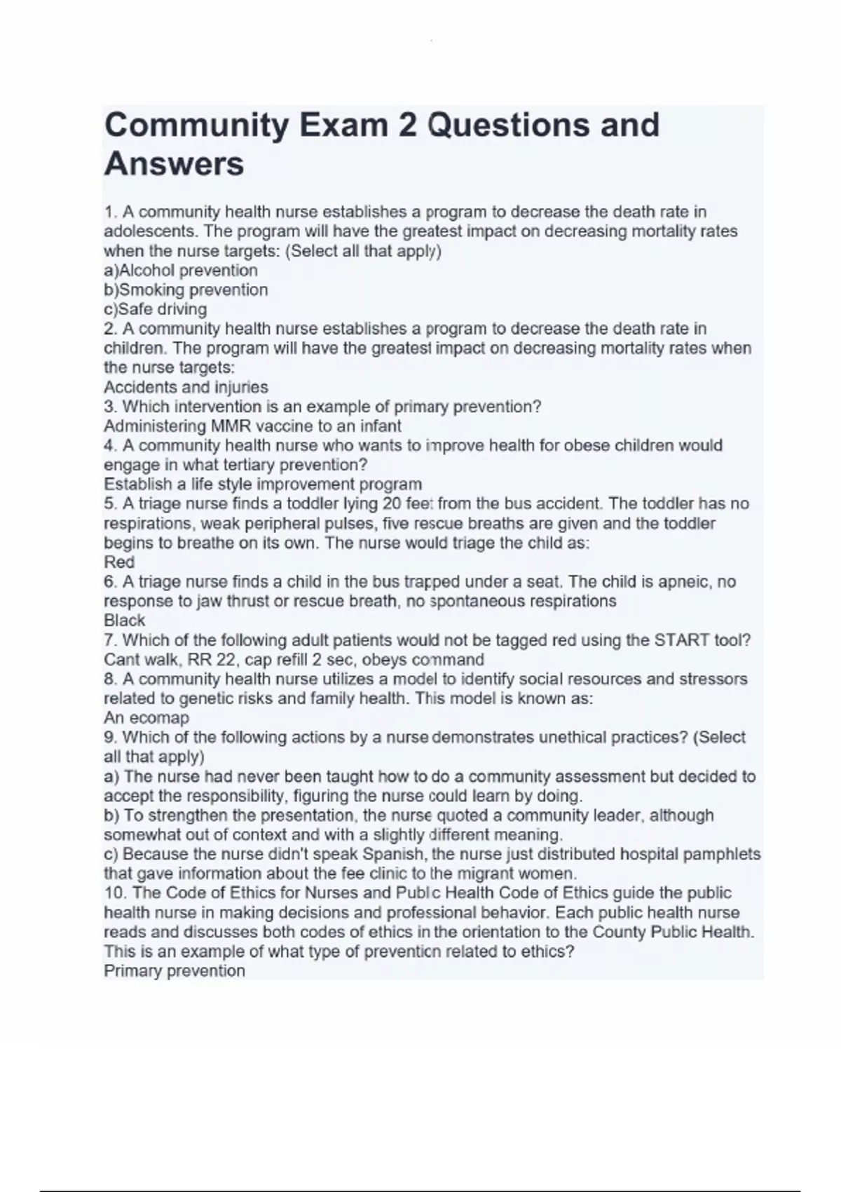 Community Exam 2 Questions and Answers 1. A community health nurse establishes a program to decrease the death rate in adolescents. The program will have the greatest impact on decreasing mortality rates when the nurse targets: (Select all that apply) a)Alcohol prevention b)Smoking prevention c)Safe driving 2. A community health nurse establishes a program to decrease the death rate in children. The program will have the greatest impact on decreasing mortality rates when the nurse targets: Accidents and injuries 3. Which intervention is an example of primary prevention? Administering MMR vaccine to an infant 4. A community health nurse who wants to improve health for obese children would engage in what tertiary prevention? Establish a life style improvement program 5. A triage nurse finds a toddler lying 20 feet from the bus accident. The toddler has no respirations, weak peripheral pulses, five rescue breaths are given and the toddler begins to breathe on its own. The nurse would triage the child as: Red