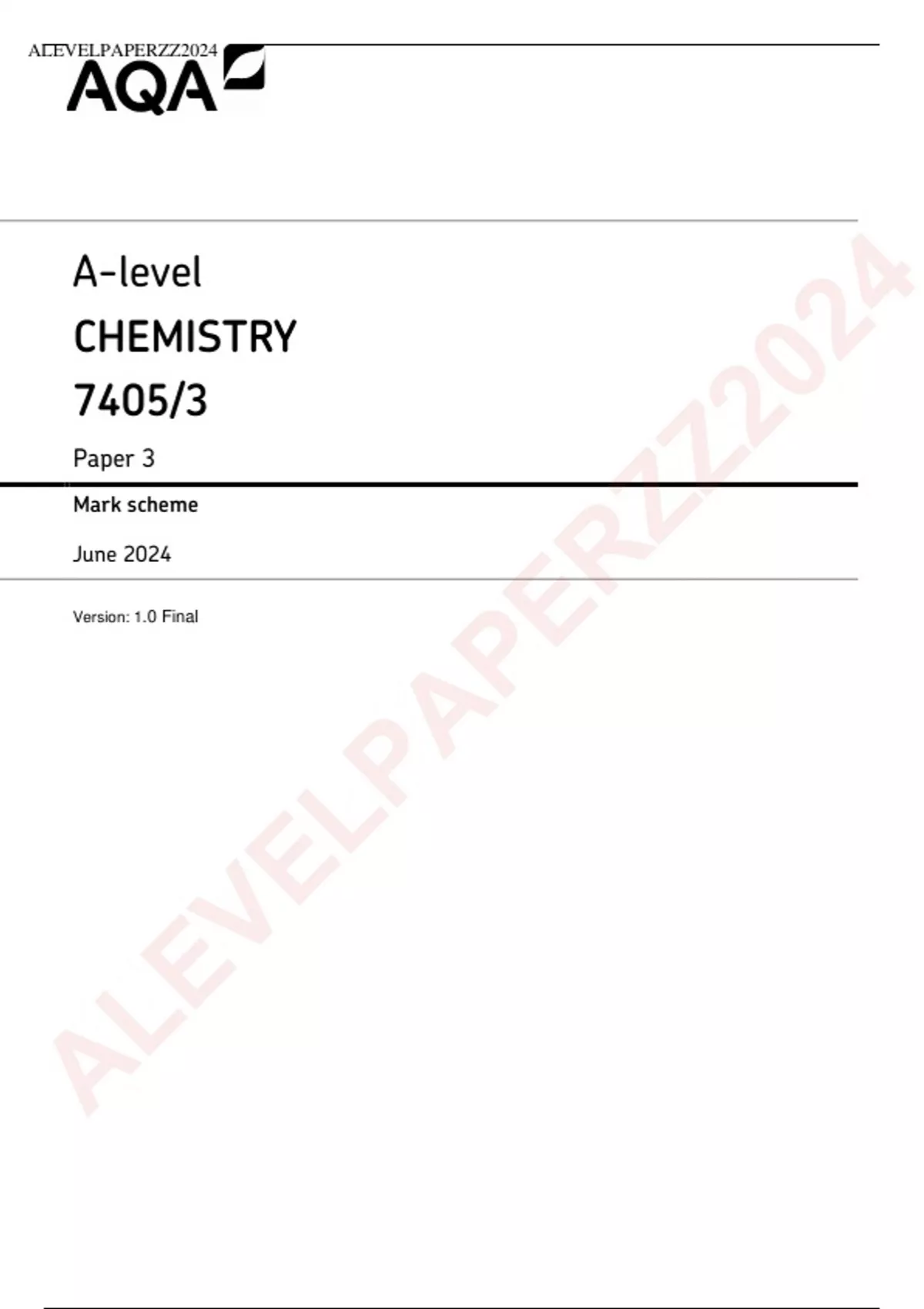 This document contains the AQA A-level Chemistry Paper 3, Mark Scheme (MS) for the 2024 exam series. Get yours now to aid in revision and upcoming mocks! *Question Paper (QP) for this document is also available for purchase individually or in a package deal with MS. (Watermarked document)