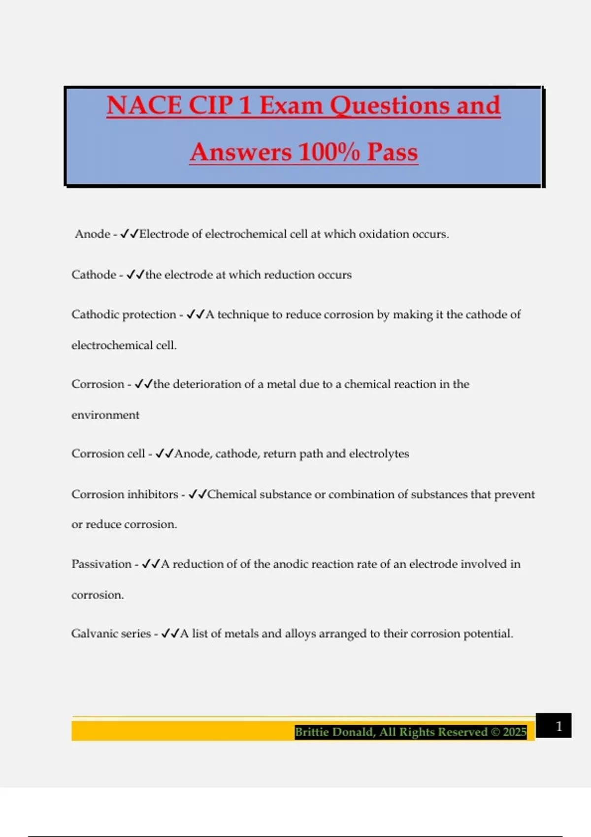NACE CIP 1 Exam Questions and Answers 100% Pass Anode - Electrode of electrochemical cell at which oxidation occurs. Cathode - the electrode at which reduction occurs Cathodic protection - A technique to reduce corrosion by making it the cathode of electrochemical cell. Corrosion - the deterioration of a metal due to a chemical reaction in the environment Corrosion cell - Anode, cathode, return path and electrolytes Corrosion inhibitors - Chemical substance or combination of substances that prevent or reduce corrosion. Passivation - A reduction of of the anodic reaction rate of an electrode involved in corrosion. Galvanic series - A list of metals and alloys arranged to their corrosion potential.