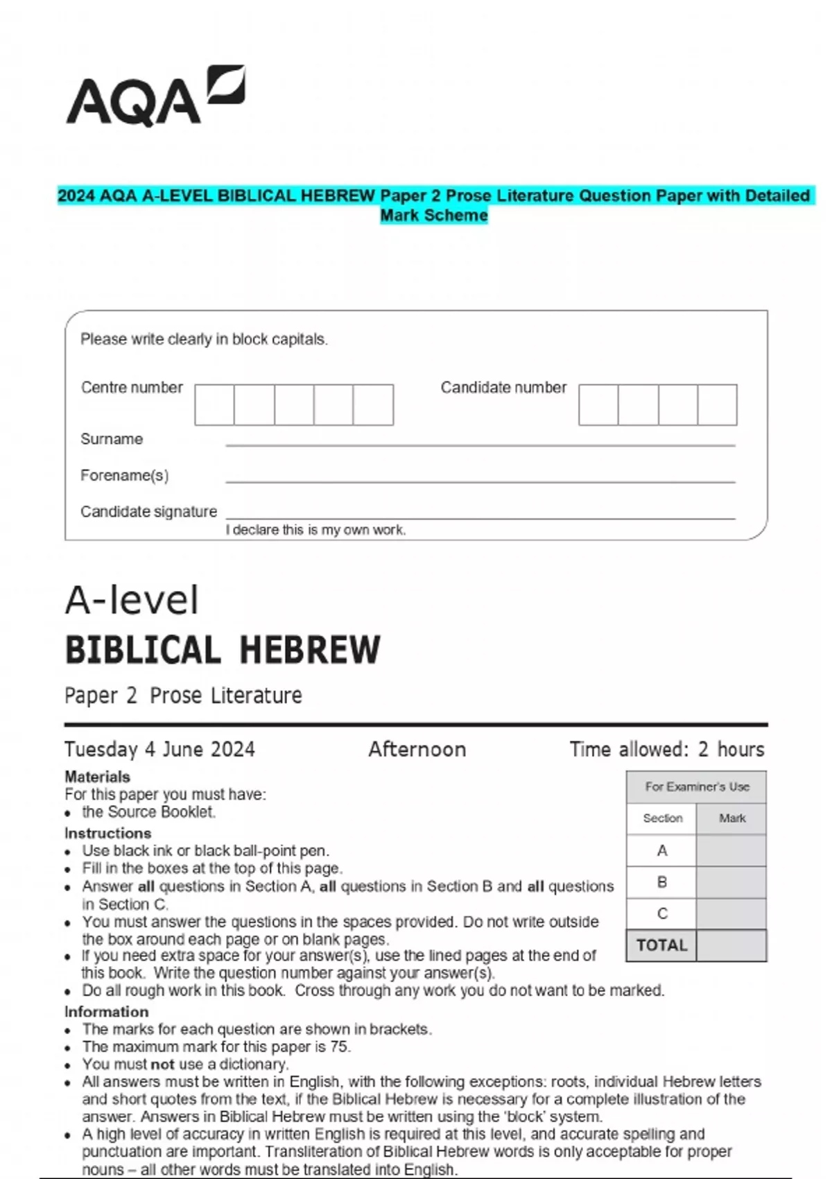 2024 AQA A-LEVEL BIBLICAL HEBREW Question Paper with Detailed Mark Scheme