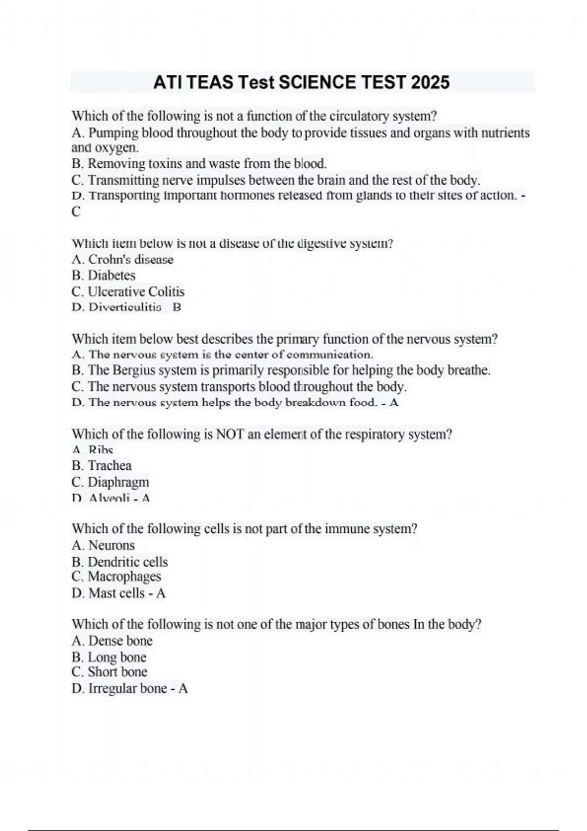 Which of the following is not a function of the circulatory system? A. Pumping blood throughout the body to provide tissues and organs with nutrients and oxygen. B. Removing toxins and waste from the blood. C. Transmitting nerve impulses between the brain and the rest of the body. D. Transporting important hormones released from glands to their sites of action. - C Which item below is not a disease of the digestive system? A. Crohn's disease B. Diabetes C. Ulcerative Colitis D. Diverticulitis - B Which item below best describes the primary function of the nervous system? A. The nervous system is the center of communication. B. The Bergius system is primarily responsible for helping the body breathe. C. The nervous system transports blood throughout the body. D. The nervous system helps the body breakdown food. - A Which of the following is NOT an element of the respiratory system? A. Ribs B. Trachea C. Diaphragm D. Alveoli - A Which of the following cells is not part of the immune system? A. Neurons B. Dendritic cells C. Macrophages D. Mast cells - A Which of the following is not one of the major types of bones In the body? A. Dense bone B. Long bone C. Short bone D. Irregular bone - A Which Of the following bone type is embedded in tendons? A. Long bones B. Sesamoid bones C. Flat bones D. Vertical bones - B Which of the following is not a product of respiration? A. Carbon dioxide B. Water C. Oxygen D. ATP - C Of the following, the blood vessel containing the least- oxygenated blood is: A. The aorta B. The vena cava C. The pulmonary artery D. The capillaries - C Which layer of the heart contains striated muscle fibers for contraction of the heart? A. Pericardium B. Epicardium C. Endocardium D. Myocardium - D Which blood vessel carries oxygenated blood back to the heart? A. Pulmonary vein B. Pulmonary artery C. Aorta D. Superior vena cava - A Which part of the cell is often called the "cell power house" because it provides energy for cellular functions? A. Nucleus B. Cell membrane C. Mitochondria D. Cytoplasm - C What functions do ribosomes serve within the cell? A. Cell movement B. Aid in protein synthesis C. Help protect the cell from its environment D. Have enzymes that help with digestion - B What is the most likely reason that cells differentiate? A. To avoid looking like all the cells around them B. So that simple, non specialized cells can become highly specialized cells C. So that multicellular organisms will remain the same size D. No apparent reason - B How is meiosis similar from mitosis? - Both occur in humans, animals, and plants How do DNA and RNA function together as part of the human genome? - RNA carries genetic information from DNA to the cell cytoplasm The majority of nutrient absorption occurs in the: - Small intestine What process should the DNA within the cell undergo before cell replication? A. The DNA should quadruple so that daughter cells have more than enough DNA material after cell division B. The DNA should triple so that daughter cells have three times the amount of DNA material after cell division C. The DNA should replicate so that daughter cells have the same amount of DNA material after cell division D. The DNA should split so that daughter cells have half the amount of DNA material after cell division - C Which statement most accurately compares and contrasts the structures of DNA and RNA? - Both DNA and RNA have 4 nucleotide bases. Three of the bases are the same but the fourth base is thymine in DNA and uracil and RNA. Which odd the following characteristics is part of a persons genotype? a. Brown eyes that appear hazel in the sunlight b. CFTR genes that cause cystic fibrosis c. black hair that grows rapidly d. being a fast runner - B Where is interstitial fluid found? - In the tissues around cells
