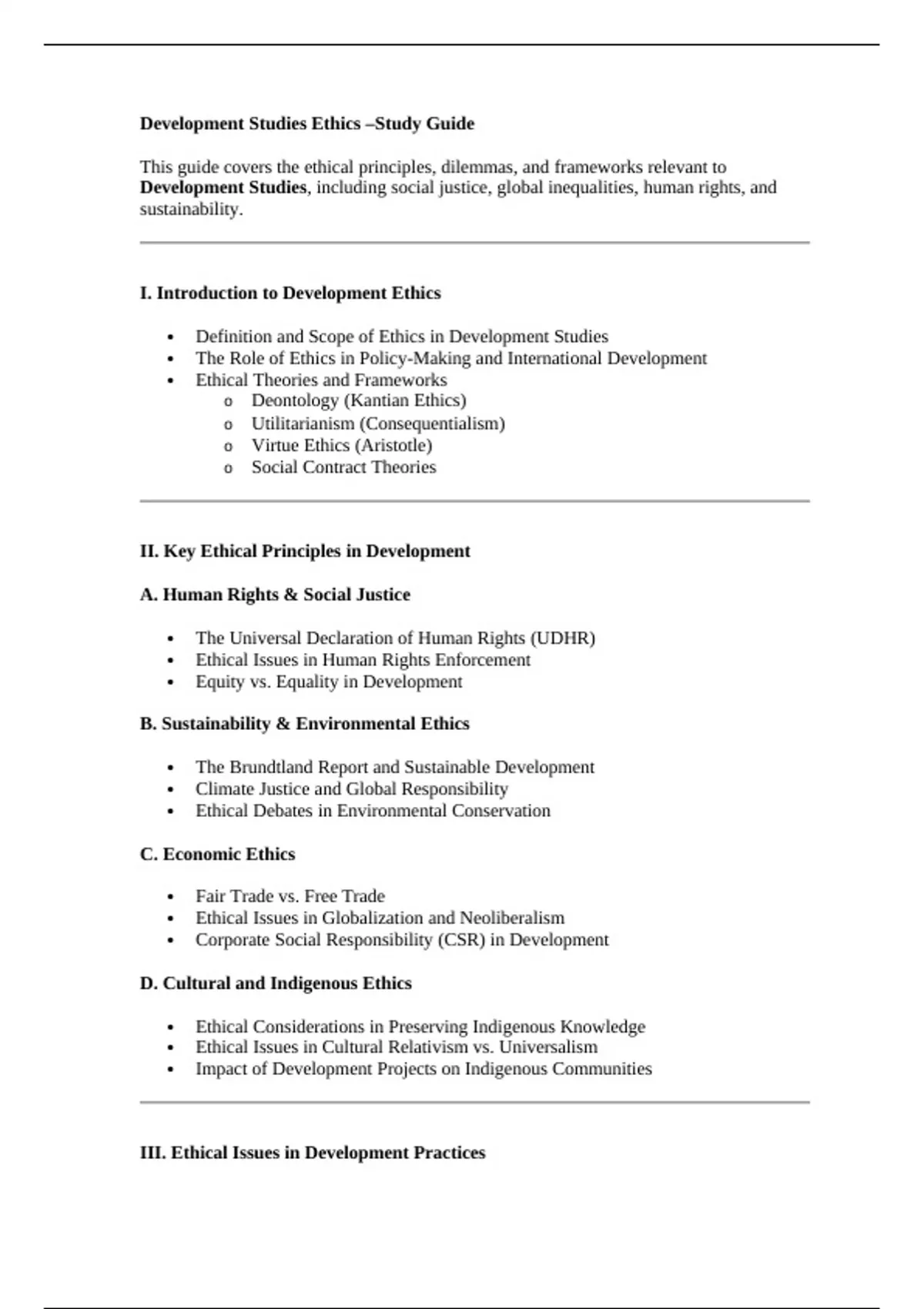 This guide covers the ethical principles, dilemmas, and frameworks relevant to Development Studies, including social justice, global inequalities, human rights, and sustainability.
