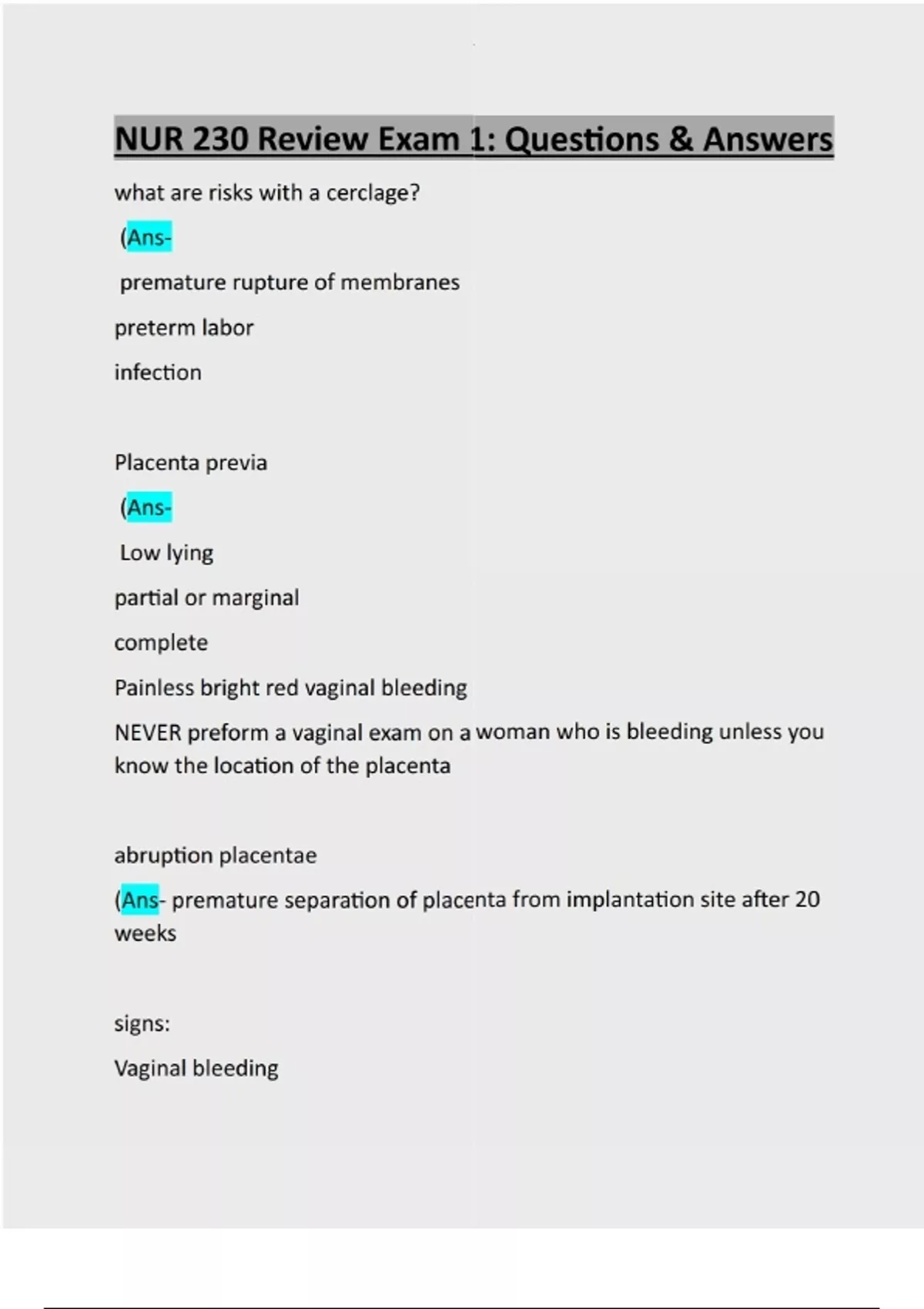 what are risks with a cerclage? (Anspremature rupture of membranes preterm labor infection Placenta previa (AnsLow lying partial or marginal complete Painless bright red vaginal bleeding NEVER preform a vaginal exam on a woman who is bleeding unless you know the location of the placenta abruption placentae (Ans- premature separation of placenta from implantation site after 20 weeks
