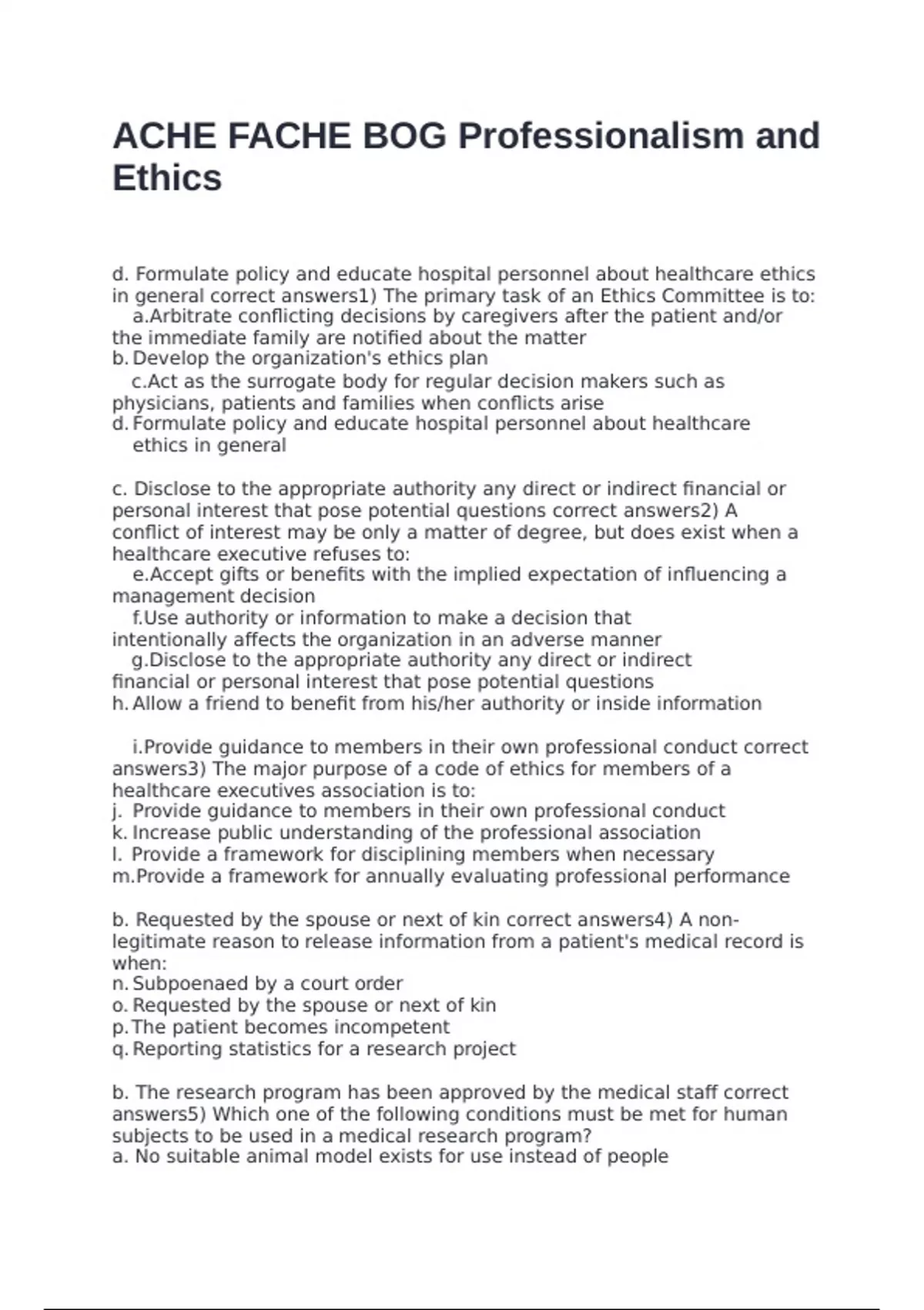 d. Formulate policy and educate hospital personnel about healthcare ethics in general correct answers1) The primary task of an Ethics Committee is to: a. Arbitrate conflicting decisions by caregivers after the patient and/or the immediate family are notified about the matter b. Develop the organization's ethics plan c. Act as the surrogate body for regular decision makers such as physicians, patients and families when conflicts arise d. Formulate policy and educate hospital personnel about healthcare ethics in general c. Disclose to the appropriate authority any direct or indirect financial or personal interest that pose potential questions correct answers2) A conflict of interest may be only a matter of degree, but does exist when a healthcare executive refuses to: a. Accept gifts or benefits with the implied expectation of influencing a management decision b. Use authority or information to make a decision that intentionally affects the organization in an adverse manner c. Disclose to the appropriate authority any direct or indirect financial or personal interest that pose potential questions d. Allow a friend to benefit from his/her authority or inside information a. Provide guidance to members in their own professional conduct correct answers3) The major purpose of a code of ethics for members of a healthcare executives association is to: a. Provide guidance to members in their own professional conduct b. Increase public understanding of the professional association c. Provide a framework for disciplining members when necessary d. Provide a framework for annually evaluating professional performance b. Requested by the spouse or next of kin correct answers4) A non-legitimate reason to release information from a patient's medical record is when: a. Subpoenaed by a court order b. Requested by the spouse or next of kin c. The patient becomes incompetent d. Reporting statistics for a research project b. The research program has been approved by the medical staff correct answers5) Which one of the following conditions must be met for human subjects to be used in a medical research program? a. No suitable animal model exists
