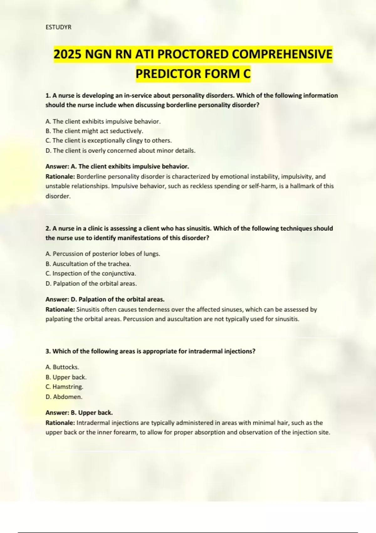 1. A nurse is developing an in-service about personality disorders. Which of the following information