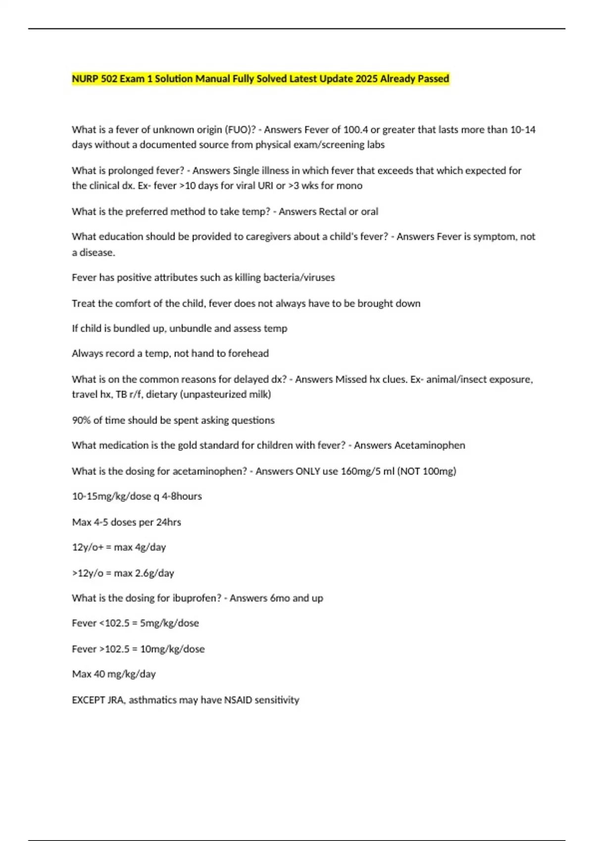 NURP 502 Exam 1 Solution Manual Fully Solved Latest Update 2025 Already Passed What is a fever of unknown origin (FUO)? - Answers Fever of 100.4 or greater that lasts more than 10-14 days without a documented source from physical exam/screening labs What is prolonged fever? - Answers Single illness in which fever that exceeds that which expected for the clinical dx. Ex- fever >10 days for viral URI or >3 wks for mono What is the preferred method to take temp? - Answers Rectal or oral What education should be provided to caregivers about a child's fever? - Answers Fever is symptom, not a disease. Fever has positive attributes such as killing bacteria/viruses Treat the comfort of the child, fever does not always have to be brought down If child is bundled up, unbundle and assess temp Always record a temp, not hand to forehead What is on the common reasons for delayed dx? - Answers Missed hx clues. Ex- animal/insect exposure, travel hx, TB r/f, dietary (unpasteurized milk) 90% of time should be spent asking questions What medication is the gold standard for children with fever? - Answers Acetaminophen What is the dosing for acetaminophen? - Answers ONLY use 160mg/5 ml (NOT 100mg) 10-15mg/kg/dose q 4-8hours Max 4-5 doses per 24hrs 12y/o+ = max 4g/day >12y/o = max 2.6g/day What is the dosing for ibuprofen? - Answers 6mo and up Fever <102.5 = 5mg/kg/dose Fever >102.5 = 10mg/kg/dose Max 40 mg/kg/day EXCEPT JRA, asthmatics may have NSAID sensitivity What workup/testing should be done for FUO? - Answers 1st line is appropriate to be done in primary care CMC, CMP, Sed rate, CRP (expensive, takes time) UA and cx, Blood cx, PPD, CXR, EBV and CMV serologies Urine specimen (straight cath is the best way) Febrile >3wks- proceed with other testing like CT, etc Be mindful of insurance, cost Which type of pneumonia is more common in kids? - Answers Viral How does penumonia present? - Answers Sudden onset, absence of respiration sx, presence of localized findings on chest auscultation-- suspect bacterial pneumo. Most common causative organism is strep pneumo What are atypical types of pneumonia? - Answers Mycoplasma, chlamydial Reason to admit with PNA? - Answers Suspicion of MRSA, underlying CV or cardiopulmonary condition, metabolic d/o, neuro d/o, developmental delay, infants > 4-6 mo Tx of PNA? - Answers High dose amoxicillin 90mg/kg/day divided in 2 doses If PNA thought to be atypical, then use a macrolide Should see clinical improvement 48-72 hrs Which of the following would indicate impending resp failure in a child with croup? Barking cough Audible stridor at rest Suprasternal and sternal retractions at rest Lethary or decreased level of consicousness - Answers Lethargy pay attention to stridor and retractions always tho Which of the following abx should be rx for the empiric tx of FUO in immucompetent children? Amoxicillin-clavulanate Azithromycin Isoniazid