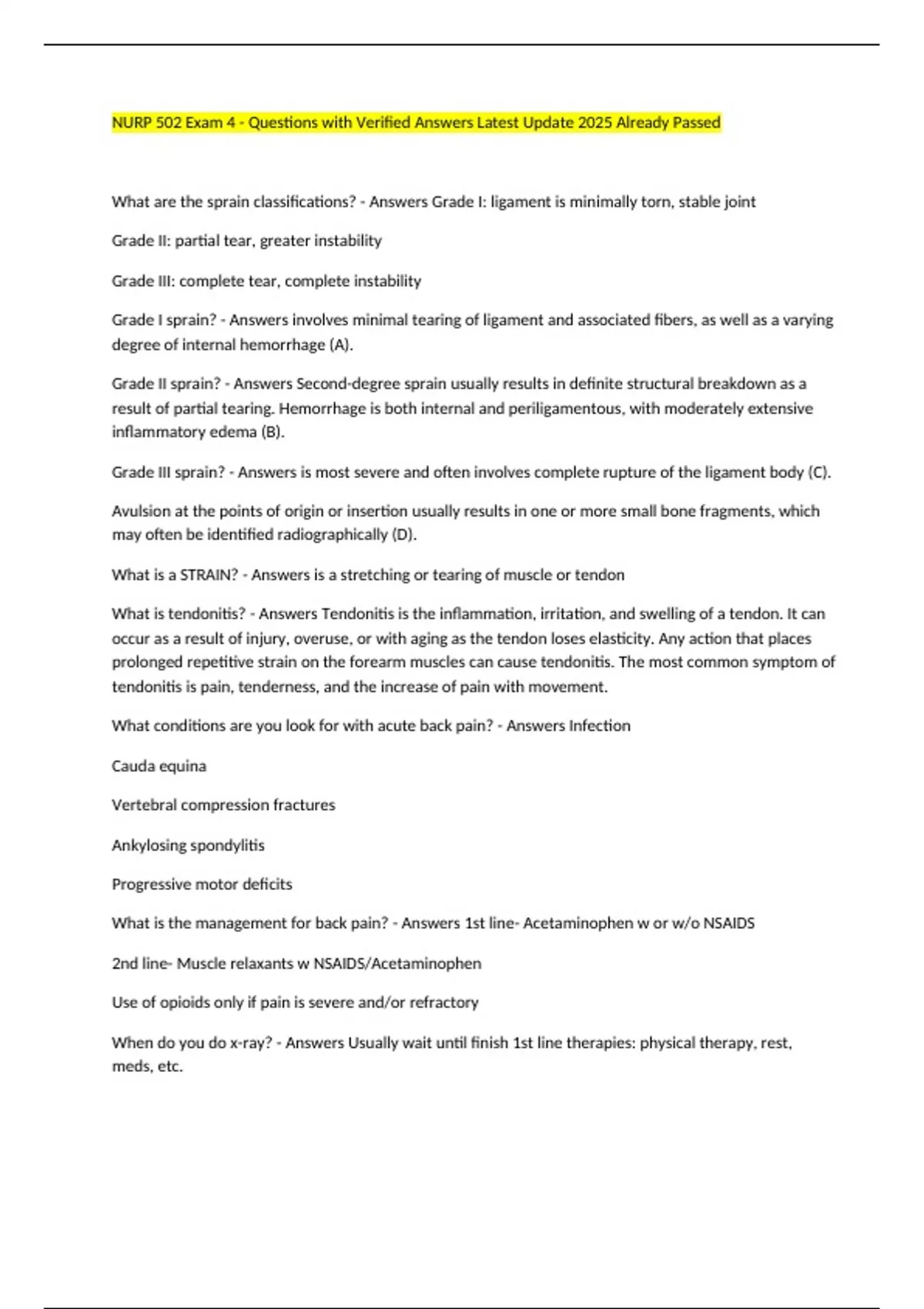 NURP 502 Exam 4 - Questions with Verified Answers Latest Update 2025 Already Passed What are the sprain classifications? - Answers Grade I: ligament is minimally torn, stable joint Grade II: partial tear, greater instability Grade III: complete tear, complete instability Grade I sprain? - Answers involves minimal tearing of ligament and associated fibers, as well as a varying degree of internal hemorrhage (A). Grade II sprain? - Answers Second-degree sprain usually results in definite structural breakdown as a result of partial tearing. Hemorrhage is both internal and periligamentous, with moderately extensive inflammatory edema (B). Grade III sprain? - Answers is most severe and often involves complete rupture of the ligament body (C). Avulsion at the points of origin or insertion usually results in one or more small bone fragments, which may often be identified radiographically (D). What is a STRAIN? - Answers is a stretching or tearing of muscle or tendon What is tendonitis? - Answers Tendonitis is the inflammation, irritation, and swelling of a tendon. It can occur as a result of injury, overuse, or with aging as the tendon loses elasticity. Any action that places prolonged repetitive strain on the forearm muscles can cause tendonitis. The most common symptom of tendonitis is pain, tenderness, and the increase of pain with movement. What conditions are you look for with acute back pain? - Answers Infection Cauda equina Vertebral compression fractures Ankylosing spondylitis Progressive motor deficits What is the management for back pain? - Answers 1st line- Acetaminophen w or w/o NSAIDS 2nd line- Muscle relaxants w NSAIDS/Acetaminophen Use of opioids only if pain is severe and/or refractory When do you do x-ray? - Answers Usually wait until finish 1st line therapies: physical therapy, rest, meds, etc. What are alternative therapies to consider when managing back pain? - Answers Acupuncture, massage, injections. TCAs, physical therapy When taking the history of an ankle injury, what is important to ask? - Answers If the injury was an eversion or inversion What are key PE techniques for the ankle? - Answers Inspect, palpate, ROM, proactive (strength, anterior drawer, syndesmosis squeeze, inversion stress test), functional (wt bearing, gait, ability to hop/stand on affected ankle) What is the squeeze test? - Answers Examiner grasps the patient's leg midway up the calf and performs a compress and release motion. A positive test is considered if the patient experiences pain in the area of the syndesmosis. + test = severe injury The Squeeze Test for syndesmosis injury following an ankle sprain is positive when pain is felt upon squeezing the fibula and tibia together. What are the Ottawa Ankle Rules? - Answers Radiographs unnecessary if the following conditions are met: 1. Patient able to walk 4 steps at time of injury or evaluation 2. No bony tenderness over distal 6cm of either malleolus Necessary if: 1. Pt cannot bear wt in office 2. Tenderness over medial and lateral malleoli, base of 5th metatarsal, or navicular bone If an x-ray is needed of the shoulder, describe the x-ray you need to order? - Answers 4 view x-ray of the shoulder Internal anteriorposterior (AP) Grashey/AP Oblique Axillary Y Views What are some finding you could expect to see on x-ray of the shoulder? - Answers Fracture Glenohymeral arthritis Significant AC joint separation What might you consider in a patient >40 y/o with shoulder pain/bruising after a fall? - Answers In a patient >40 with no prior history shoulder pain, negative x-rays, consider a massive rotator cuff tear. MRI would be more sensitive to this condition This will require an ortho referral if positive for a tear What are differential diagnoses for knee injury? - Answers Several, some include the following: ACL MCL Sprain/strain Ruptured achilles Chondromalacia (patellar fx= surgical emergency) What are the Ottawa rules for Knee pain? - Answers > 65 y/o Patellar pain Tenderness at head of fibula Inability to flex knee at 90 degrees Inability to bear weight (4 steps) immediately after injury and on exam What is important about a knee x-ray for the older population? - Answers Get an x-ray