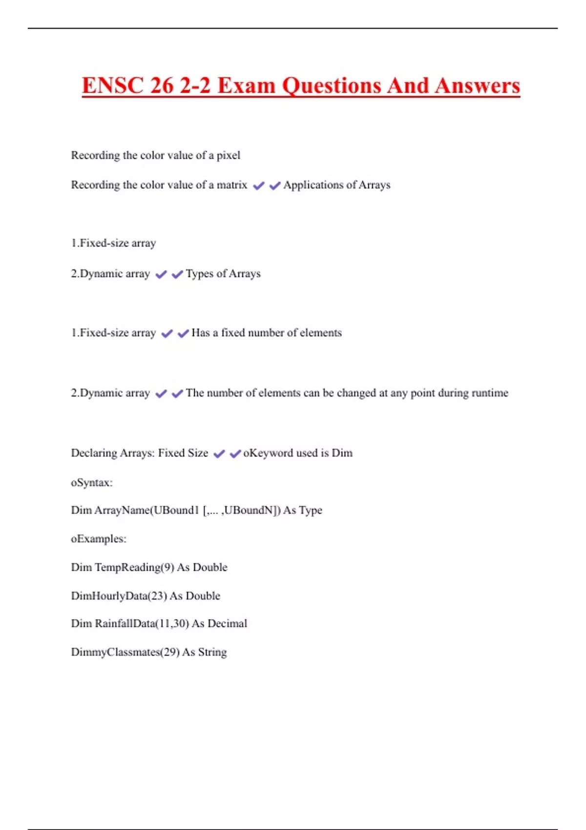 ENSC 26 2-2 Exam Questions And Answers Recording the color value of a pixel Recording the color value of a matrix Applications of Arrays 1.Fixed-size array 2.Dynamic array Types of Arrays 1.Fixed-size array Has a fixed number of elements 2.Dynamic array The number of elements can be changed at any point during runtime