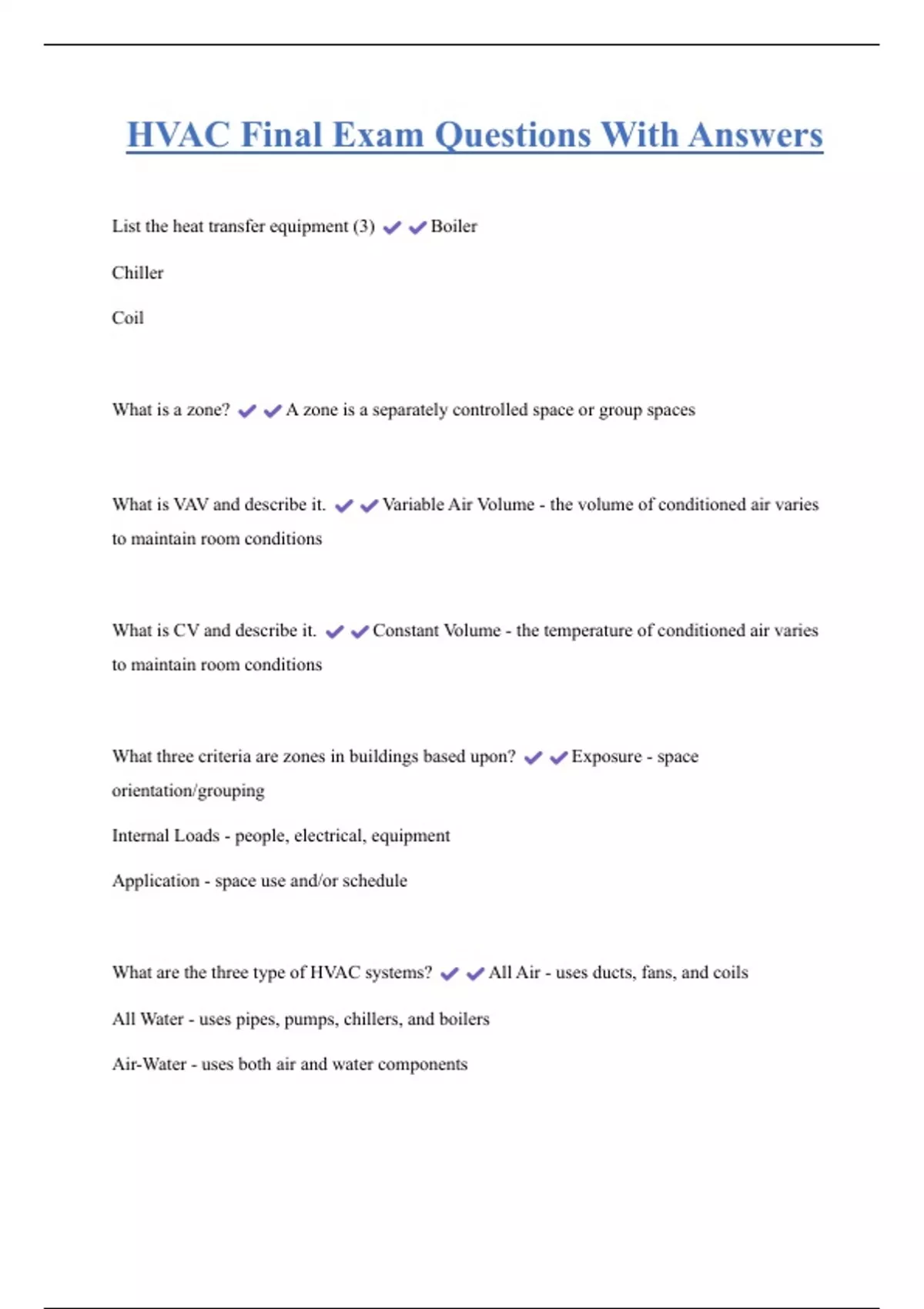 What are the three type of HVAC systems? All Air - uses ducts, fans, and coils
