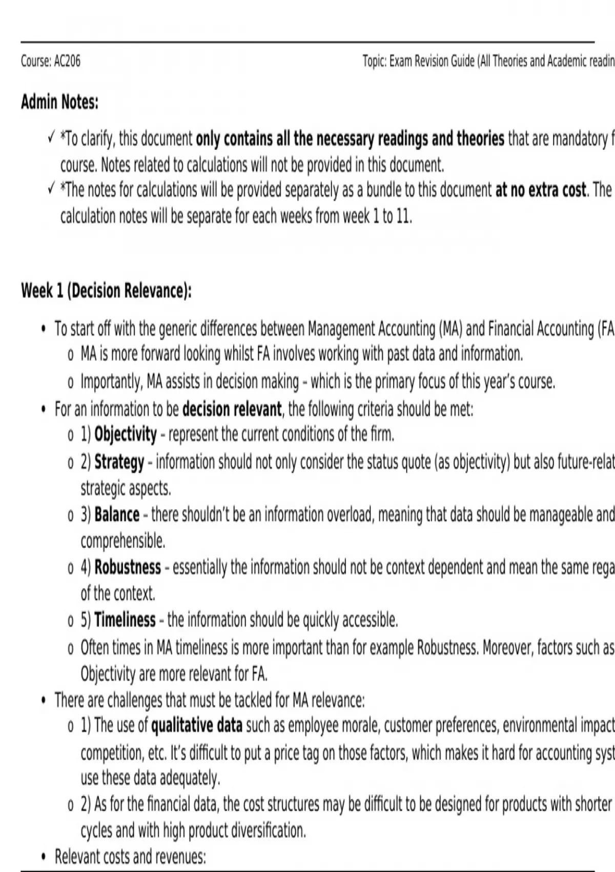 truggling with AC206? Get high-quality, exam-focused notes covering all readings, weekly lecture content, and key concepts in one place. These notes provide clear, structured summaries of essential topics, helping you revise efficiently and boost your grades. Complete reading summaries – Save time by skipping lengthy readings Concise weekly lecture notes – Focus on what really matters Exam-oriented content – Prioritising key theories & calculations Perfect for last-minute revision – Straight to the point, easy to digest