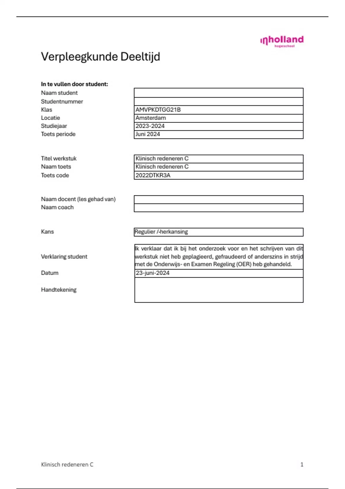 Verklaring student werkstuk niet heb geplagieerd, gefraudeerd of anderszins in strijd