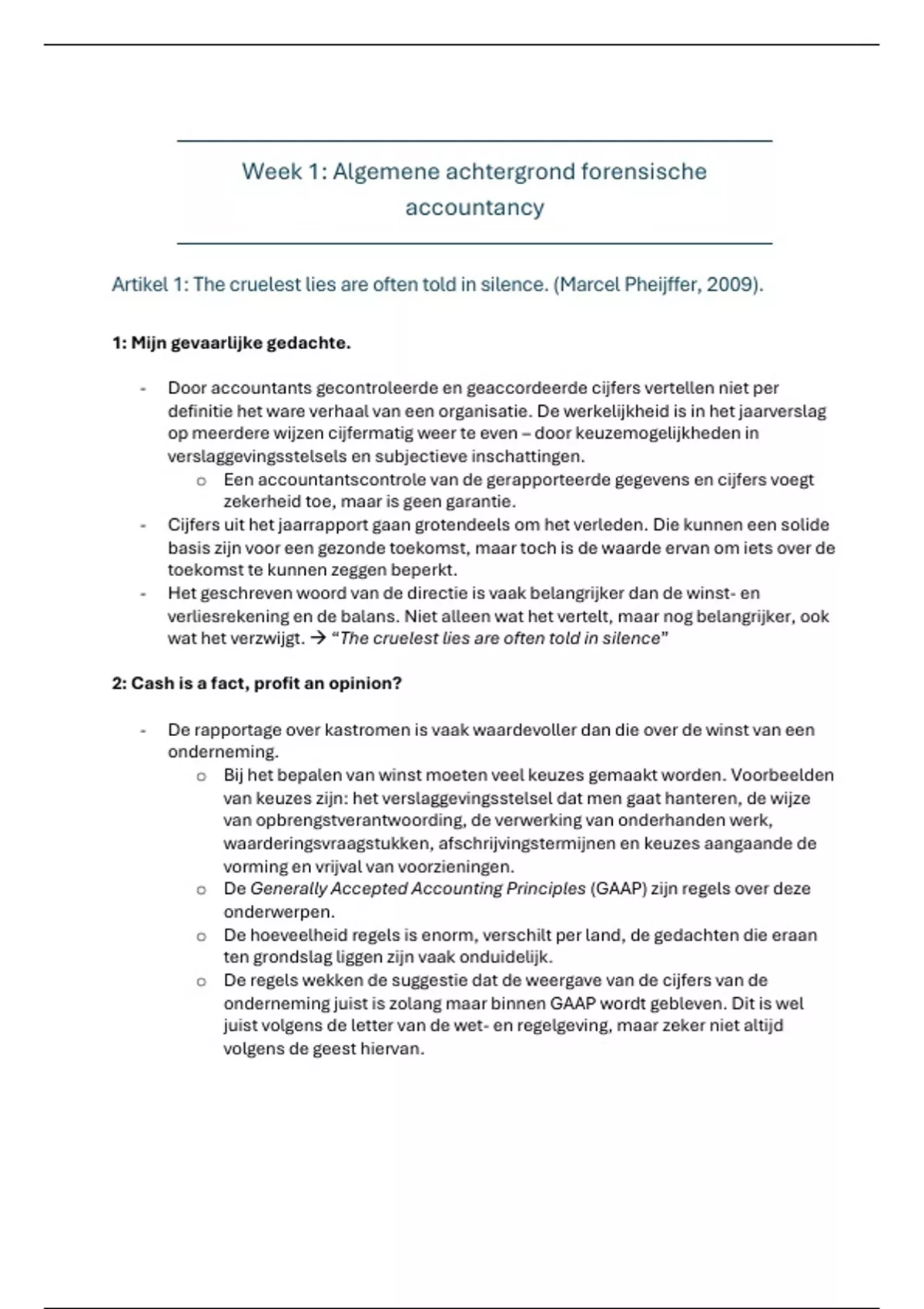 Een uitgebreide samenvatting van alle literatuur die is voorgeschreven voor het vak Forensische Accountancy van de master Forensische Criminologie aan de Universiteit Leiden. Let op: de samenvatting is niet aangevuld met college-aantekeningen. Zelf behaalde ik het tentamen met een 8.9.