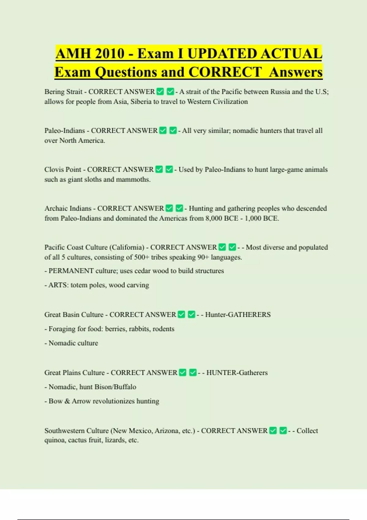AMH 2010 - Exam I UPDATED ACTUAL Exam Questions and CORRECT Answers Bering Strait - CORRECT ANSWER - A strait of the Pacific between Russia and the U.S; allows for people from Asia, Siberia to travel to Western Civilization Paleo-Indians - CORRECT ANSWER - All very similar; nomadic hunters that travel all over North America