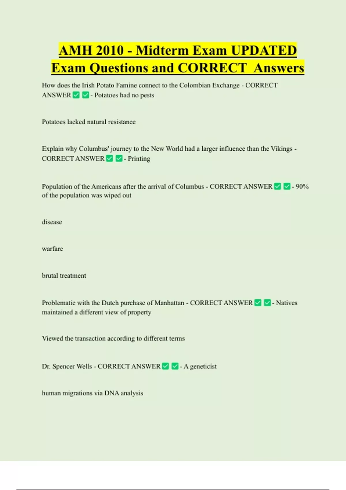 AMH 2010 - Midterm Exam UPDATED Exam Questions and CORRECT Answers How does the Irish Potato Famine connect to the Colombian Exchange - CORRECT ANSWER - Potatoes had no pests Potatoes lacked natural resistance Explain why Columbus' journey to the New World had a larger influence than the Vikings - CORRECT ANSWER - Printing