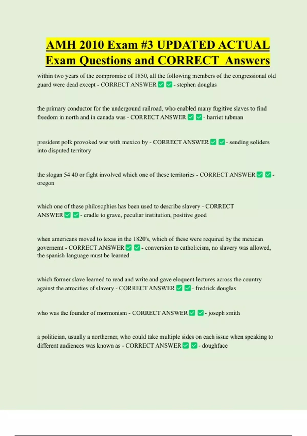 AMH 2010 Exam #3 UPDATED ACTUAL Exam Questions and CORRECT Answers within two years of the compromise of 1850, all the following members of the congressional old guard were dead except - CORRECT ANSWER - stephen douglas the primary conductor for the undergound railroad, who enabled many fugitive slaves to find freedom in north and in canada was - CORRECT ANSWER - harriet tubman