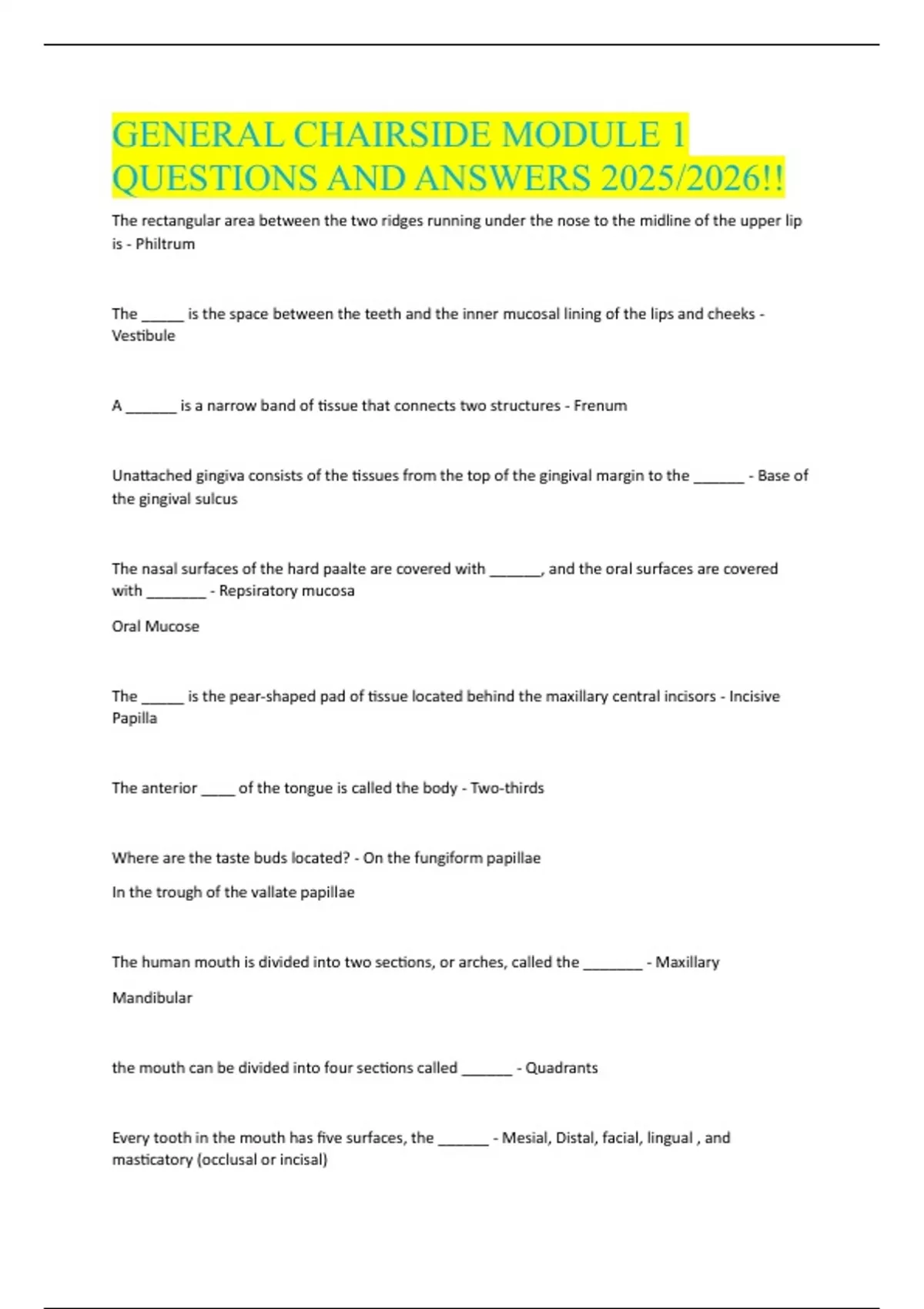 GENERAL CHAIRSIDE MODULE 1 QUESTIONS AND ANSWERS 2025/2026!! The rectangular area between the two ridges running under the nose to the midline of the upper lip is - Philtrum The _____ is the space between the teeth and the inner mucosal lining of the lips and cheeks - Vestibule A ______ is a narrow band of tissue that connects two structures - Frenum Unattached gingiva consists of the tissues from the top of the gingival margin to the ______ - Base of the gingival sulcus The nasal surfaces of the hard paalte are covered with ______, and the oral surfaces are covered with _______ - Repsiratory mucosa Oral Mucose The _____ is the pear-shaped pad of tissue located behind the maxillary central incisors - Incisive Papilla The anterior ____ of the tongue is called the body - Two-thirds Where are the taste buds located? - On the fungiform papillae In the trough of the vallate papillae The human mouth is divided into two sections, or arches, called the _______ - Maxillary Mandibular