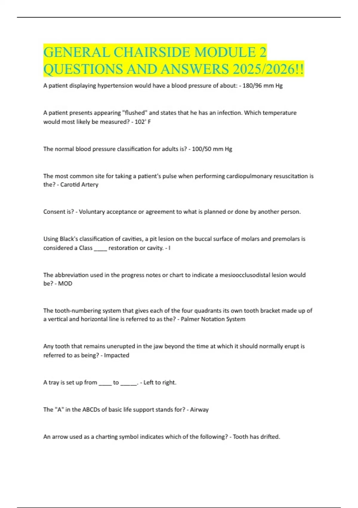 GENERAL CHAIRSIDE MODULE 2 QUESTIONS AND ANSWERS 2025/2026!! A patient displaying hypertension would have a blood pressure of about: - 180/96 mm Hg A patient presents appearing "flushed" and states that he has an infection. Which temperature would most likely be measured? - 102' F The normal blood pressure classification for adults is? - 100/50 mm Hg The most common site for taking a patient's pulse when performing cardiopulmonary resuscitation is the? - Carotid Artery Consent is? - Voluntary acceptance or agreement to what is planned or done by another person. Using Black's classification of cavities, a pit lesion on the buccal surface of molars and premolars is considered a Class ____ restoration or cavity. - I The abbreviation used in the progress notes or chart to indicate a mesioocclusodistal lesion would be? - MOD The tooth-numbering system that gives each of the four quadrants its own tooth bracket made up of a vertical and horizontal line is referred to as the? - Palmer Notation System Any tooth that remains unerupted in the jaw beyond the time at which it should normally erupt is referred to as being? - Impacted