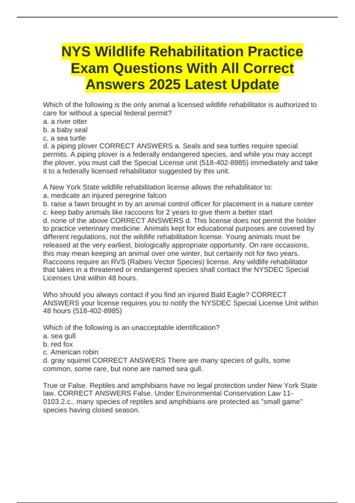 NYS Wildlife Rehabilitation Practice Exam Questions With All Correct Answers 2025 Latest Update