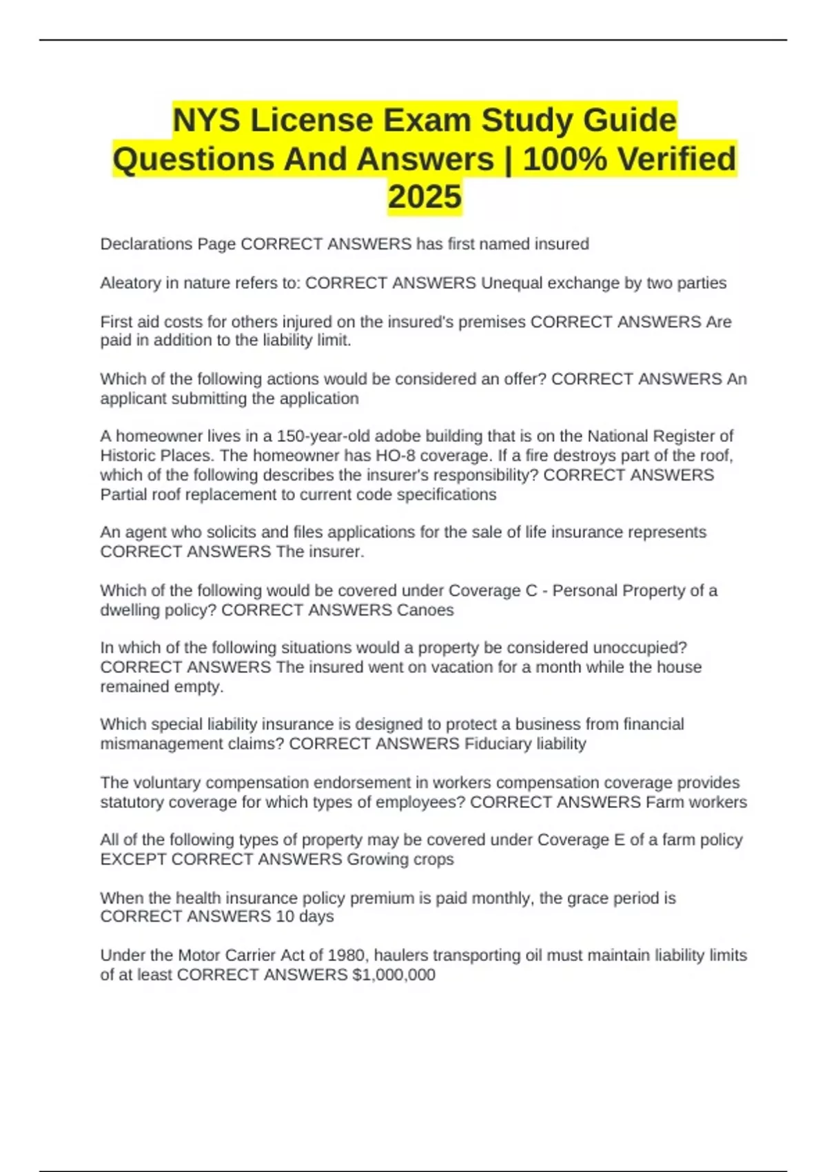 NYS License Exam Study Guide Questions And Answers | 100% Verified 2025
