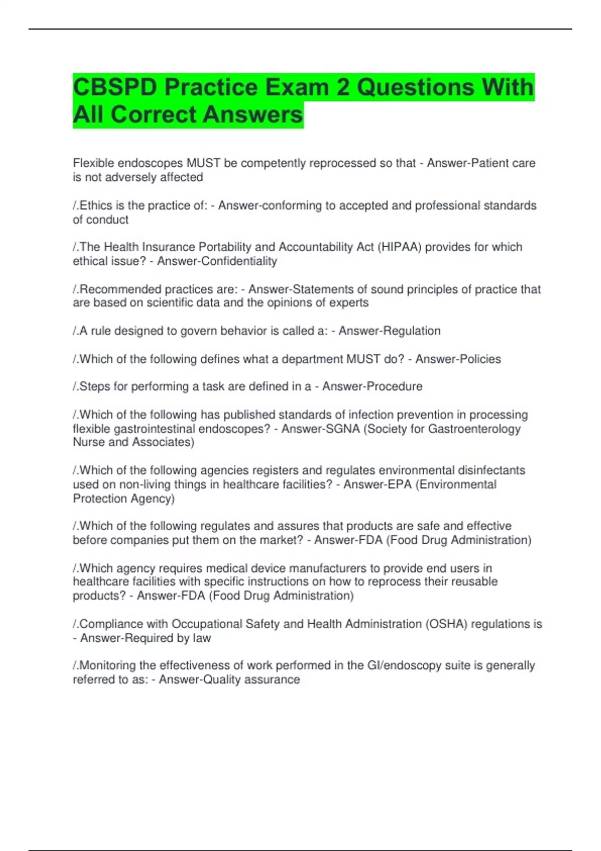 CBSPD Practice Exam 2 Questions With All Correct Answers Flexible endoscopes MUST be competently reprocessed so that - Answer-Patient care is not adversely affected /.Ethics is the practice of: - Answer-conforming to accepted and professional standards of conduct /.The Health Insurance Portability and Accountability Act (HIPAA) provides for which ethical issue? - Answer-Confidentiality /.Recommended practices are: - Answer-Statements of sound principles of practice that are based on scientific data and the opinions of experts /.A rule designed to govern behavior is called a: - Answer-Regulation /.Which of the following defines what a department MUST do? - Answer-Policies /.Steps for performing a task are defined in a - Answer-Procedure /.Which of the following has published standards of infection prevention in processing flexible gastrointestinal endoscopes? - Answer-SGNA (Society for Gastroenterology Nurse and Associates) /.Which of the following agencies registers and regulates environmental disinfectants used on non-living things in healthcare facilities? - Answer-EPA (Environmental Protection Agency) /.Which of the following regulates and assures that products are safe and effective before companies put them on the market? - Answer-FDA (Food Drug Administration) /.Which agency requires medical device manufacturers to provide end users in healthcare facilities with specific instructions on how to reprocess their reusable products? - Answer-FDA (Food Drug Administration) /.Compliance with Occupational Safety and Health Administration (OSHA) regulations is - Answer-Required by law /.Monitoring the effectiveness of work performed in the GI/endoscopy suite is generally referred to as: - Answer-Quality assurance /.The policies and procedures for all reprocessing activities in the GI/endoscopy suite are usually reviewed and/or approved by the: - Answer-Infection Prevention and Control Committee /.Which branch of science refers to the form and organization of body parts? - Answer-Anatomy /.Which branch of science refers to the function of specific body parts? - Answer-Physiology /.The smallest and MOST numerous structural units possessing the basic characteristics of life are called - Answer-Cells /.The nucleus is the cell's: - Answer-Brain /.DNA (deoxyribonucleic acid) is found in which part of the cell? - Answer-Nucleus /.Which of the following is the largest internal organ of the body? - Answer-Liver /.The tendency of the body to maintain a stable internal environment is referred to as: - Answer-Homeostaisis /.DNA is the only molecule in the body capable of: - Answer-Reproducing itself /.The term pathogenic means: - Answer-Disease-producing /.Which of the following deals with microorganisms and their effects on other living organisms? - Answer-Microbiology /.Microorganisms are measured in? - Answer-Microns /.Bacteria are unicellular and reproduce by: - Answer-Binary fission /.Which type of microorganism has the ability to slow down its metabolism and become dormant? - Answer-Gram-positive bacillus /.Which of the following is NOT a requirement for bacteria to survive? - Answer-Bright light /.A dehydrated microorganism with a thick, shell-like wall is known as a - Answer-Spore /.Which of the following describes the shape of the bacterium Pseudomonas? - Answer-Rod /.In order to survive, aerobic bacteria require - Answer-Oxygen