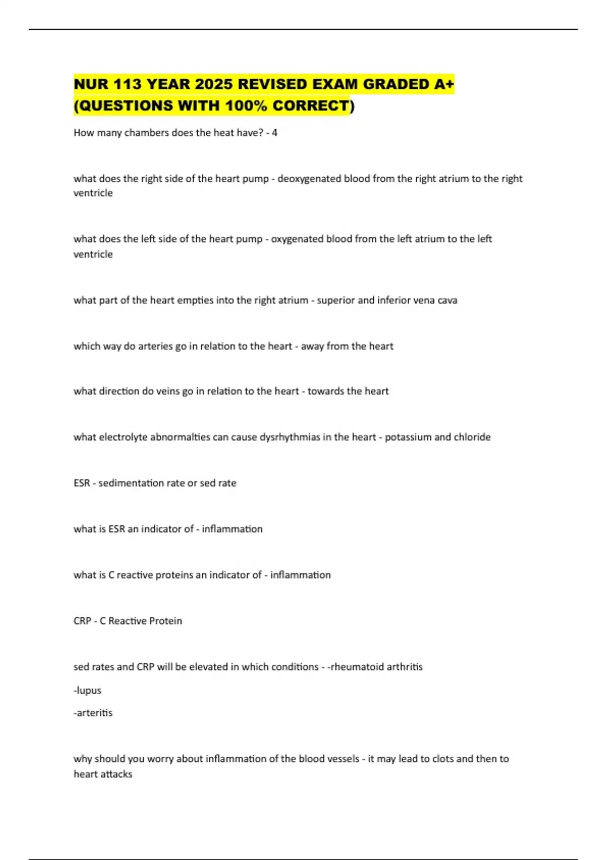NUR 113 YEAR 2025 REVISED EXAM GRADED A+ (QUESTIONS WITH 100% CORRECT) How many chambers does the heat have? - 4 what does the right side of the heart pump - deoxygenated blood from the right atrium to the right ventricle what does the left side of the heart pump - oxygenated blood from the left atrium to the left ventricle what part of the heart empties into the right atrium - superior and inferior vena cava which way do arteries go in relation to the heart - away from the heart what direction do veins go in relation to the heart - towards the heart what electrolyte abnormalties can cause dysrhythmias in the heart - potassium and chloride ESR - sedimentation rate or sed rate what is ESR an indicator of - inflammation what is C reactive proteins an indicator of - inflammation CRP - C Reactive Protein