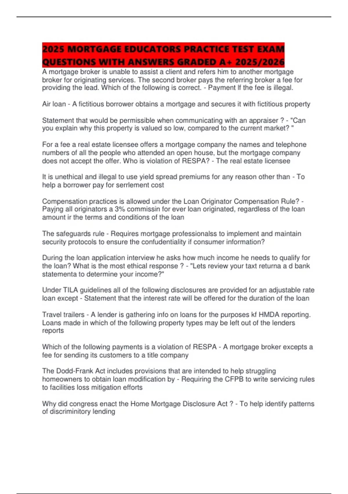 2025 MORTGAGE EDUCATORS PRACTICE TEST EXAM QUESTIONS WITH ANSWERS GRADED A+ 2025/2026