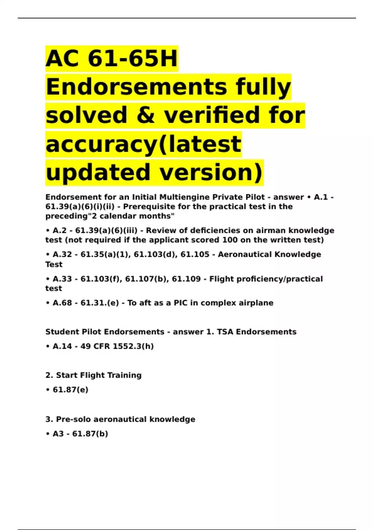 AC 61-65H Endorsements fully solved & verified for accuracy(latest updated version)