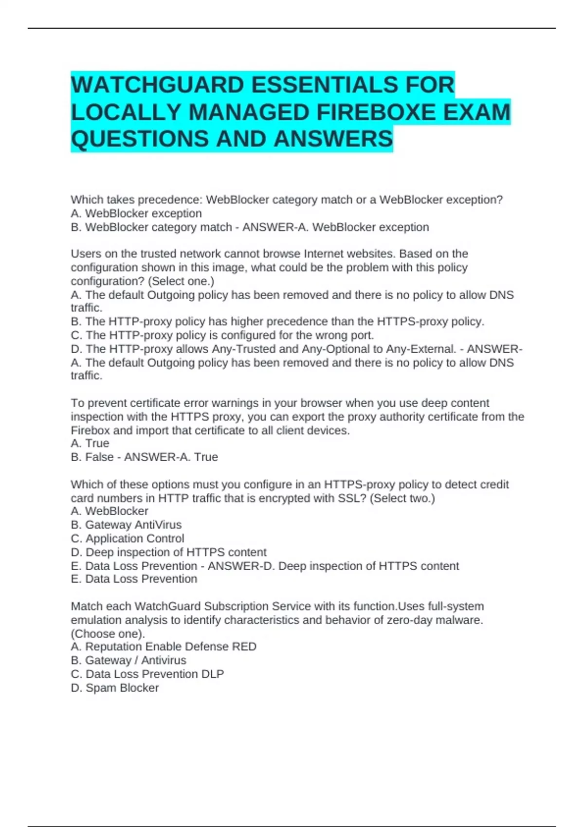 WATCHGUARD ESSENTIALS FOR LOCALLY MANAGED FIREBOXE EXAM QUESTIONS AND ANSWERSWATCHGUARD ESSENTIALS FOR LOCALLY MANAGED FIREBOXE EXAM QUESTIONS AND ANSWERSWATCHGUARD ESSENTIALS FOR LOCALLY MANAGED FIREBOXE EXAM QUESTIONS AND ANSWERS Which takes precedence: WebBlocker category match or a WebBlocker exception? A. WebBlocker exception B. WebBlocker category match - ANSWER-A. WebBlocker exception Users on the trusted network cannot browse Internet websites. Based on the configuration shown in this image, what could be the problem with this policy configuration? (Select one.) A. The default Outgoing policy has been removed and there is no policy to allow DNS traffic. B. The HTTP-proxy policy has higher precedence than the HTTPS-proxy policy. C. The HTTP-proxy policy is configured for the wrong port. D. The HTTP-proxy allows Any-Trusted and Any-Optional to Any-External. - ANSWER-A. The default Outgoing policy has been removed and there is no policy to allow DNS traffic. To prevent certificate error warnings in your browser when you use deep content inspection with the HTTPS proxy, you can export the proxy authority certificate from the