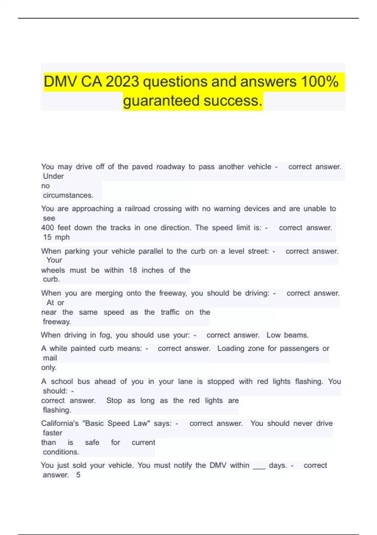 DMV CA 2023 questions and answers 100% guaranteed success.