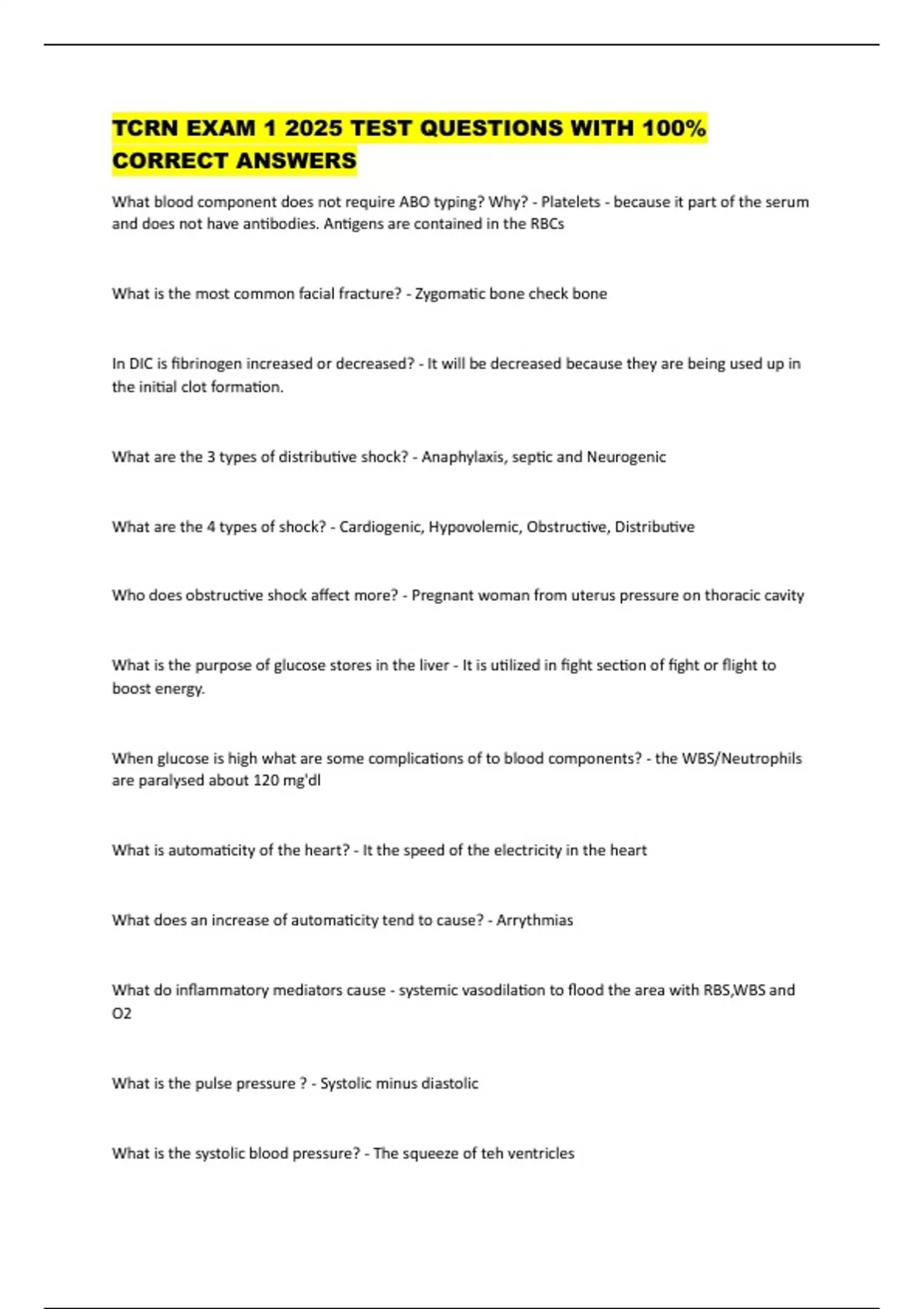 TCRN EXAM 1 2025 TEST QUESTIONS WITH 100% CORRECT ANSWERS What blood component does not require ABO typing? Why? - Platelets - because it part of the serum and does not have antibodies. Antigens are contained in the RBCs What is the most common facial fracture? - Zygomatic bone check bone In DIC is fibrinogen increased or decreased? - It will be decreased because they are being used up in the initial clot formation. What are the 3 types of distributive shock? - Anaphylaxis, septic and Neurogenic What are the 4 types of shock? - Cardiogenic, Hypovolemic, Obstructive, Distributive Who does obstructive shock affect more? - Pregnant woman from uterus pressure on thoracic cavity What is the purpose of glucose stores in the liver - It is utilized in fight section of fight or flight to boost energy. When glucose is high what are some complications of to blood components? - the WBS/Neutrophils are paralysed about 120 mg'dl What is automaticity of the heart? - It the speed of the electricity in the heart What does an increase of automaticity tend to cause? - Arrythmias What do inflammatory mediators cause - systemic vasodilation to flood the area with RBS,WBS and