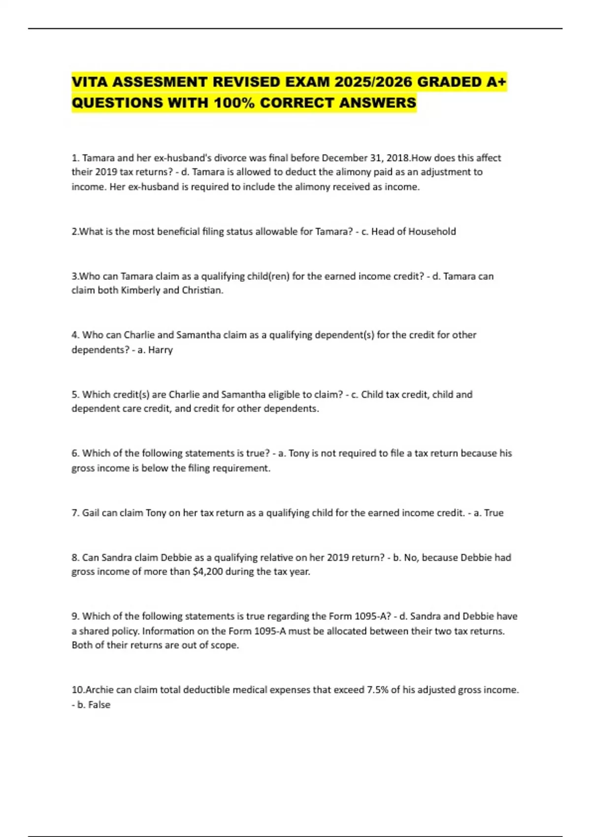 VITA ASSESMENT REVISED EXAM 2025/2026 GRADED A+ QUESTIONS WITH 100% CORRECT ANSWERS 1. Tamara and her ex-husband's divorce was final before December 31, 2018.How does this affect their 2019 tax returns? - d. Tamara is allowed to deduct the alimony paid as an adjustment to income. Her ex-husband is required to include the alimony received as income. 2.What is the most beneficial filing status allowable for Tamara? - c. Head of Household 3.Who can Tamara claim as a qualifying child(ren) for the earned income credit? - d. Tamara can claim both Kimberly and Christian. 4. Who can Charlie and Samantha claim as a qualifying dependent(s) for the credit for other dependents? - a. Harry 5. Which credit(s) are Charlie and Samantha eligible to claim? - c. Child tax credit, child and dependent care credit, and credit for other dependents. 6. Which of the following statements is true? - a. Tony is not required to file a tax return because his gross income is below the filing requirement. 7. Gail can claim Tony on her tax return as a qualifying child for the earned income credit. - a. True 8. Can Sandra claim Debbie as a qualifying relative on her 2019 return? - b. No, because Debbie had gross income of more than $4,200 during the tax year.