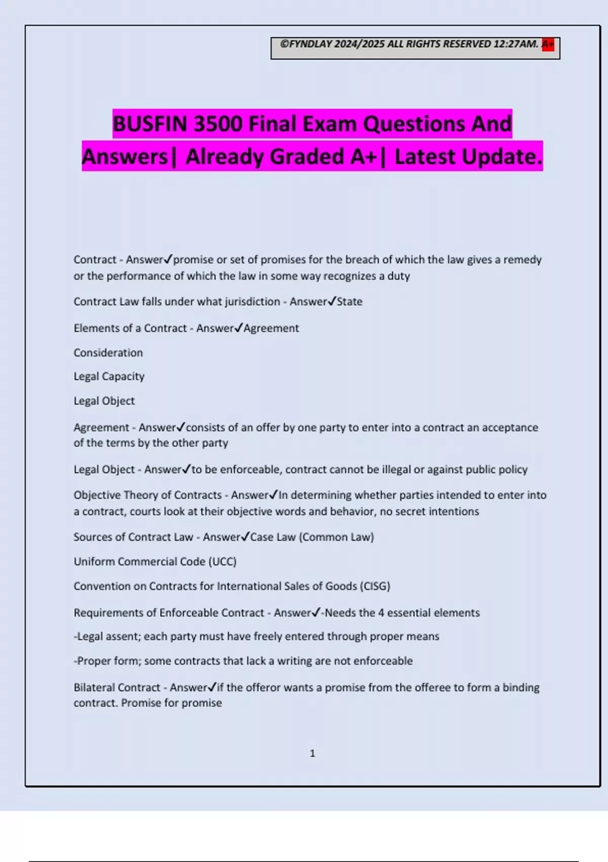 Requirements of Enforceable Contract - Answer✔-Needs the 4 essential elements