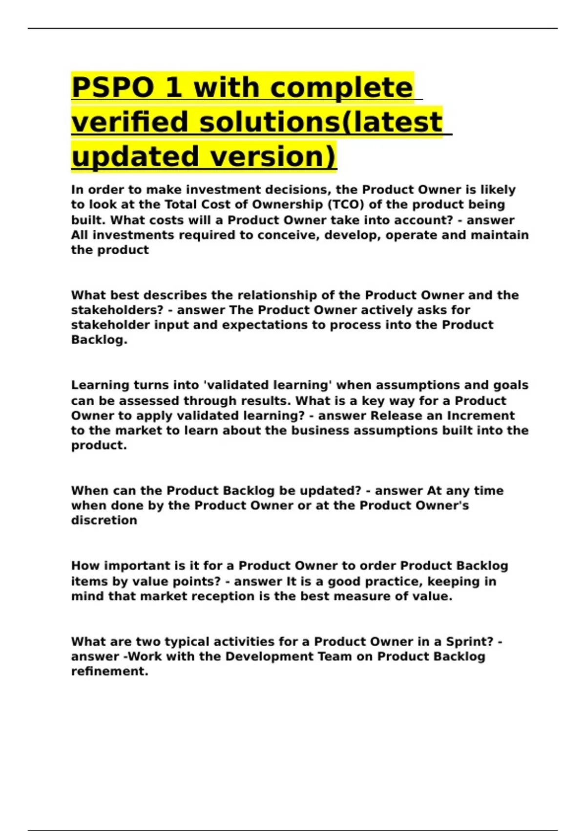 PSPO 1 with complete verified solutions(latest updated version)