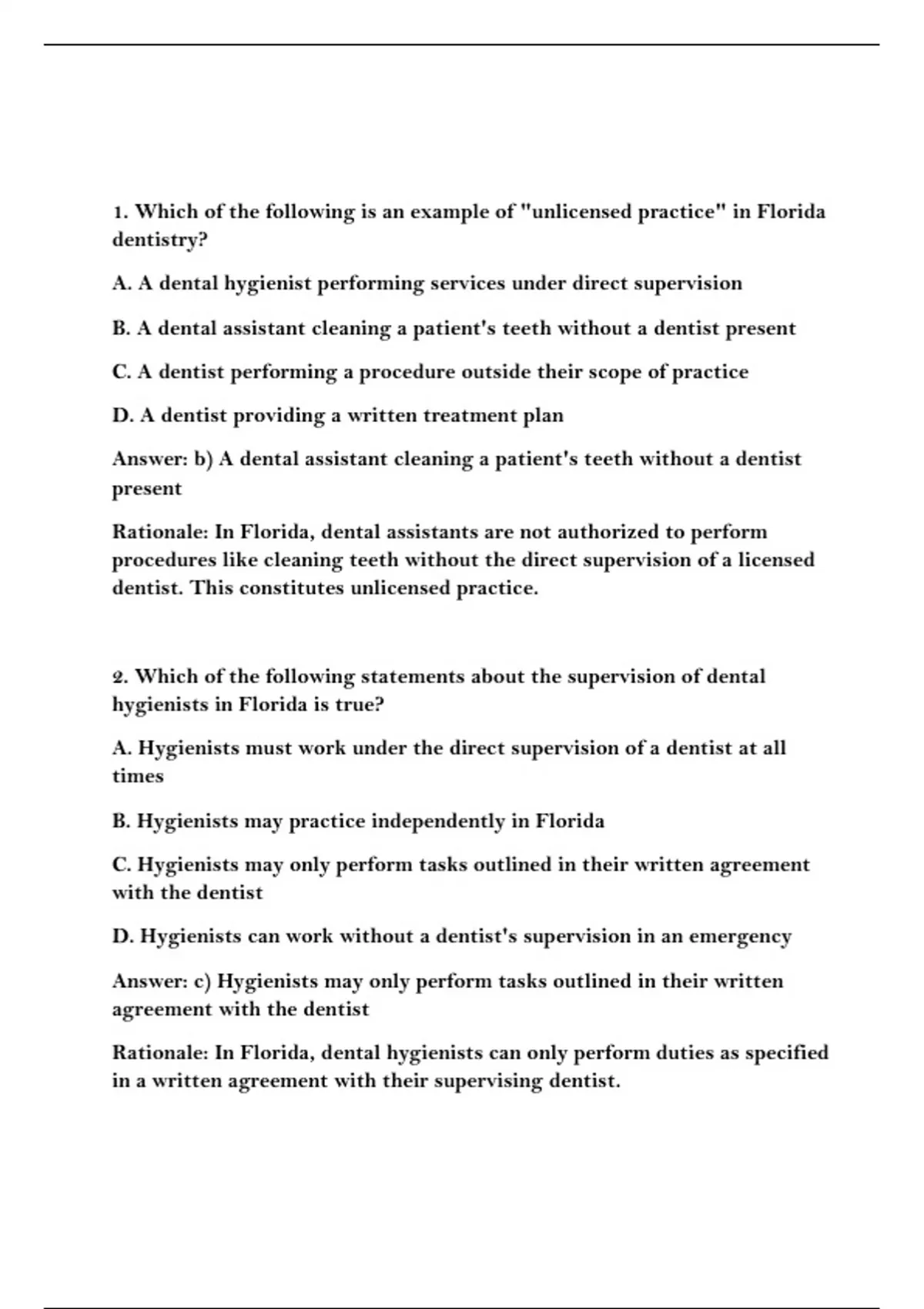 Rationale: In Florida, dental hygienists can only perform duties as specified
