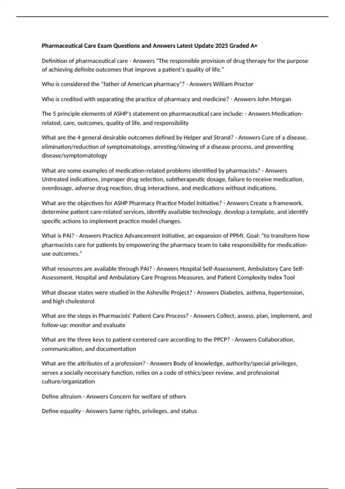 Pharmaceutical Care Exam Questions and Answers Latest Update 2025 Graded A+ Definition of pharmaceutical care - Answers "The responsible provision of drug therapy for the purpose of achieving definite outcomes that improve a patient's quality of life." Who is considered the "father of American pharmacy"? - Answers William Proctor Who is credited with separating the practice of pharmacy and medicine? - Answers John Morgan The 5 principle elements of ASHP's statement on pharmaceutical care include: - Answers Medication-related, care, outcomes, quality of life, and responsibility What are the 4 general desirable outcomes defined by Helper and Strand? - Answers Cure of a disease, elimination/reduction of symptomatology, arresting/slowing of a disease process, and preventing disease/symptomatology What are some examples of medication-related problems identified by pharmacists? - Answers Untreated indications, improper drug selection, subtherapeutic dosage, failure to receive medication, overdosage, adverse drug reaction, drug interactions, and medications without indications. What are the objectives for ASHP Pharmacy Practice Model Initiative? - Answers Create a framework, determine patient care-related services, identify available technology, develop a template, and identify specific actions to implement practice model changes. What is PAI? - Answers Practice Advancement Initiative, an expansion of PPMI. Goal: "to transform how pharmacists care for patients by empowering the pharmacy team to take responsibility for medication-use outcomes." What resources are available through PAI? - Answers Hospital Self-Assessment, Ambulatory Care Self-Assessment, Hospital and Ambulatory Care Progress Measures, and Patient Complexity Index Tool What disease states were studied in the Asheville Project? - Answers Diabetes, asthma, hypertension, and high cholesterol What are the steps in Pharmacists' Patient Care Process? - Answers Collect, assess, plan, implement, and follow-up: monitor and evaluate What are the three keys to patient-centered care according to the PPCP? - Answers Collaboration, communication, and documentation What are the attributes of a profession? - Answers Body of knowledge, authority/special privileges, serves a socially necessary function, relies on a code of ethics/peer review, and professional culture/organization Define altruism - Answers Concern for welfare of others Define equality - Answers Same rights, privileges, and status