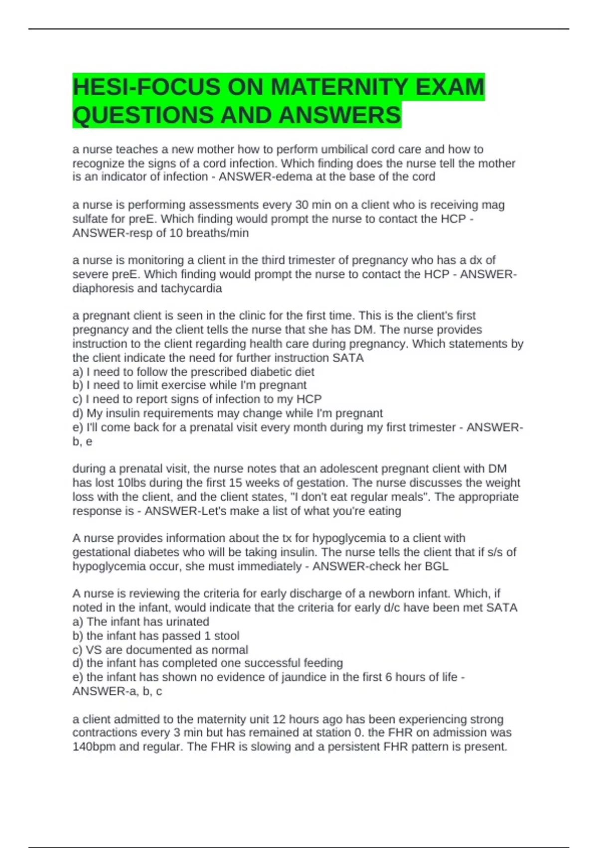 HESI-FOCUS ON MATERNITY EXAM QUESTIONS AND ANSWERS