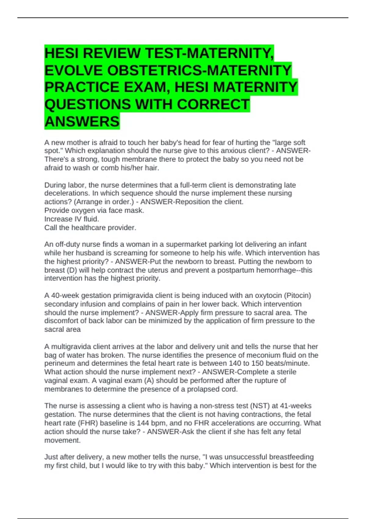 HESI REVIEW TEST-MATERNITY, EVOLVE OBSTETRICS-MATERNITY PRACTICE EXAM, HESI MATERNITY QUESTIONS WITH CORRECT ANSWERS