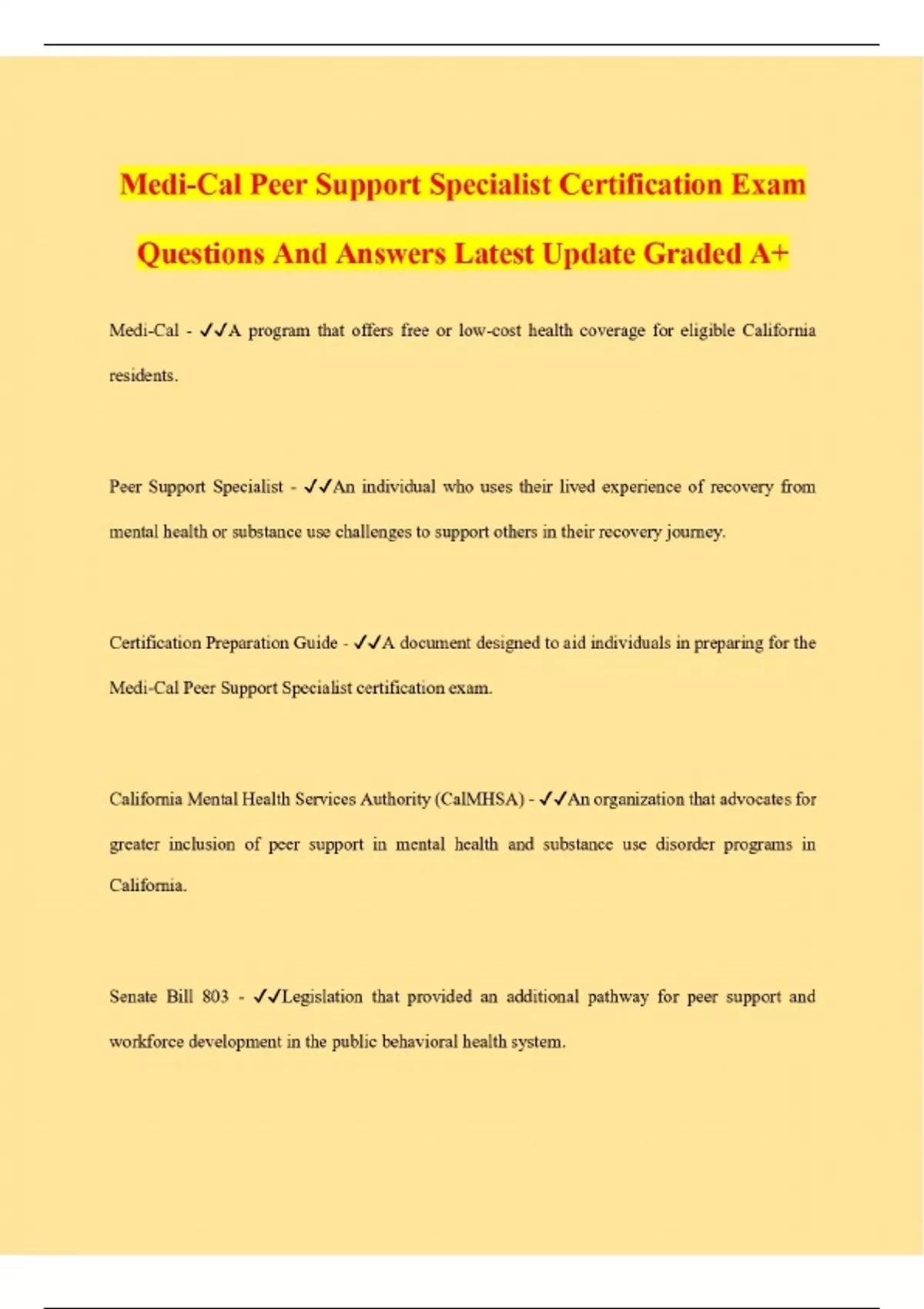 Medi-Cal Peer Support Specialist Certification Exam Questions And Answers Latest Update Graded A+