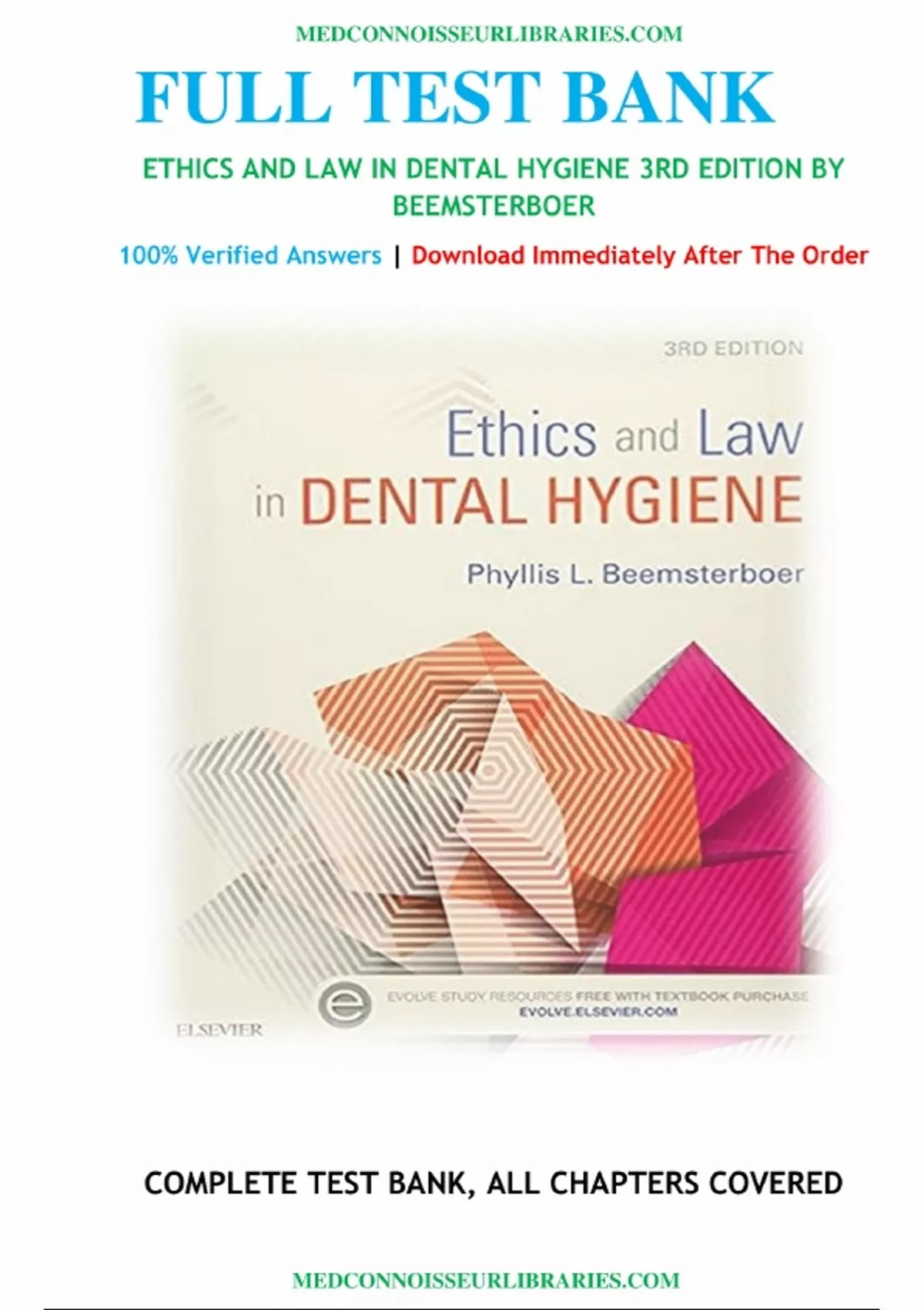 TEST BANK FOR ETHICS AND LAW IN DENTAL HYGIENE 3RD EDITION BY BEEMSTERBOER, ALL CHAPTERS COVERED: ISBN-10 5463 ISBN-13 978-3, A+ guide. Chapter 01: Ethics and Professionalism Beemsterboer: Ethics and Law in Dental Hygiene, 3rd Edition MULTIPLE CHOICE 1. When was the inception of the profession of dental hygiene? a. In ancient Greece b. In the early 1800s c. In the early 1900s d. In 1979 ANS: C The scope of practice of a dental hygienist was first established by law in Connecticut in 1915. Alfred C. Fones taught his dental assistant, Irene Newman, to treat patients and to teach them to maintain their mouths in a clean state. In 1913, Fones established the first school for dental hygienists in Bridgeport, Connecticut. The first oath written for dental hygienists called upon Apollo and Hygeia, who were the Greek god and goddess of health, respectively. A modernized version of the first oath was adopted by the Board of Trustees of the American Dental Hygienists’ Association (ADHA) in 1979. DIF: Recall REF: p. 3 OBJ: 1 TOP: 7.0 Professional Responsibility | 7.1 Ethical Principles, including informed consent 2. Which member of the dental team is the primary oral preventive therapist? a. Dentist b. Dental hygienist c. Dental assistant d. Receptionist ANS: B The dental hygienist is the oral preventive therapist in the dental office. The dentists who pioneered this special field of endeavor had a vision of the day when dental disease could be prevented by following a system of treatment and cleanliness. The dentist is primarily concerned with restor ...