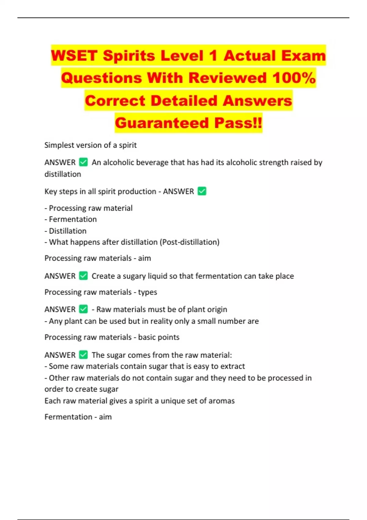 WSET Spirits Level 1 Actual Exam Questions With Reviewed 100% Correct Detailed Answers Guaranteed Pass!! Simplest version of a spirit ANSWER distillation An alcoholic beverage that has had its alcoholic strength raised by Key steps in all spirit production - ANSWER - Processing raw material - Fermentation - Distillation - What happens after distillation (Post-distillation) Processing raw materials - aim ANSWER Create a sugary liquid so that fermentation can take place Processing raw materials - types ANSWER - Raw materials must be of plant origin - Any plant can be used but in reality only a small number are Processing raw materials - basic points ANSWER The sugar comes from the raw material: - Some raw materials contain sugar that is easy to extract - Other raw materials do not contain sugar and they need to be processed in order to create sugar Each raw material gives a spirit a unique set of aromas Fermentation - aim ANSWER The main aim of fermentation is to turn a sugary liquid into an alcoholic liquid Fermentation - how it works ANSWER Yeast ANSWER Yeast and sugar are needed for alcoholic fermentation to take place Microorganisms that are added to the sugary liquid in fermentation They eat the sugar and create ethanol and carbon dioxide gas ANSWER Ethanol An alcohol that the distiller wants in fermentation ANSWER Carbon dioxide gas Waste product in fermentation ANSWER After fermentation the alcoholic liquid is... Typically between 8% and 10% abv ANSWER abv